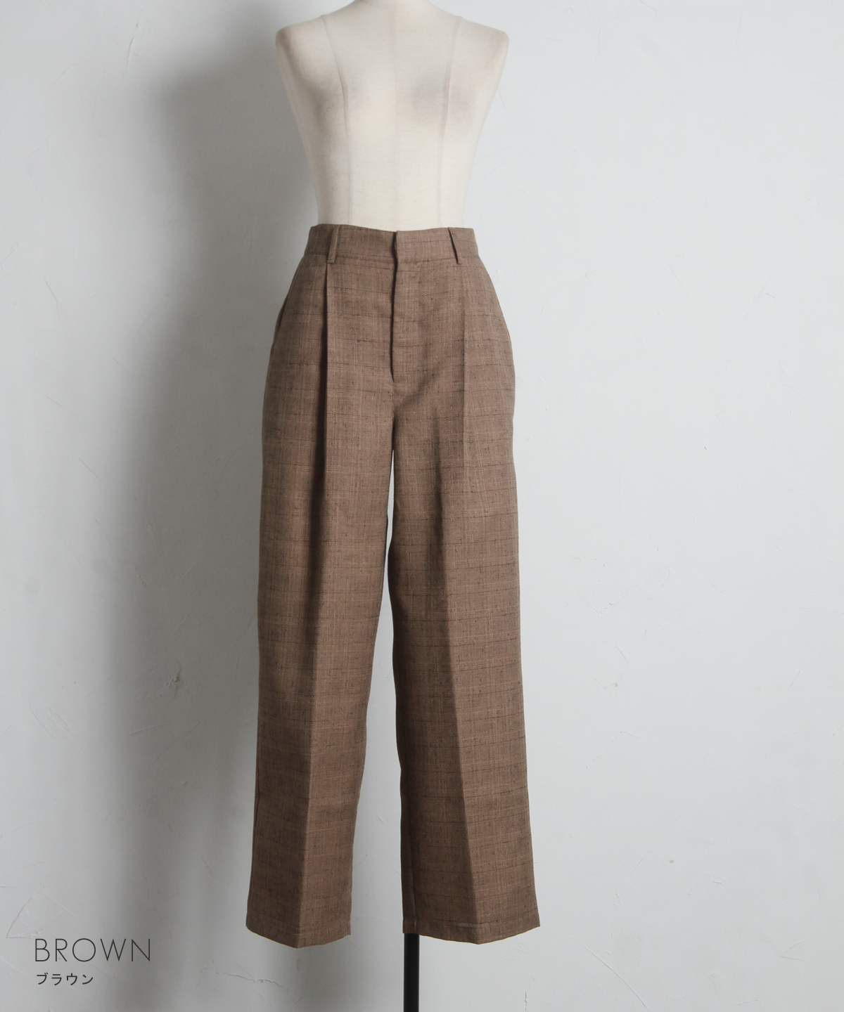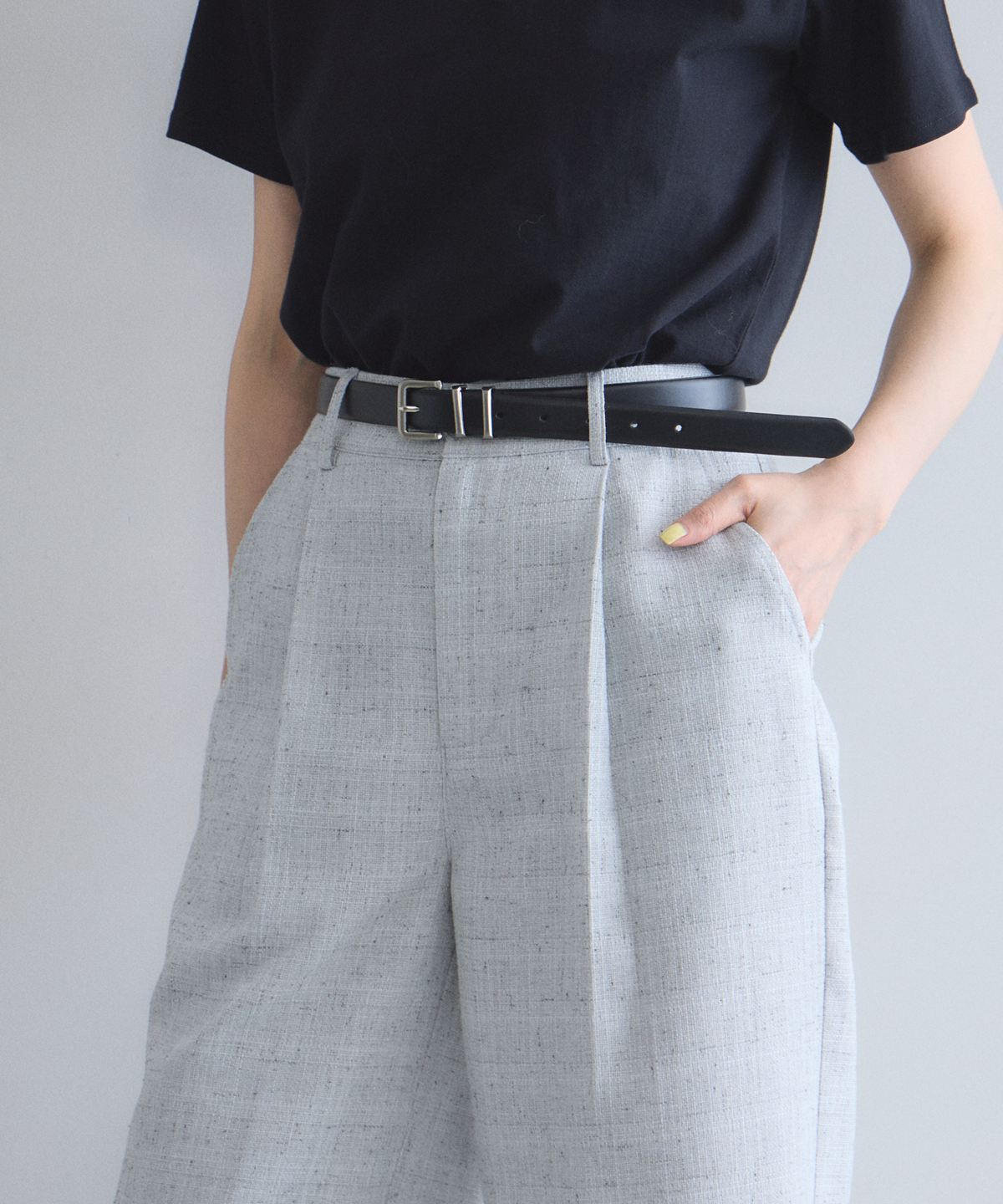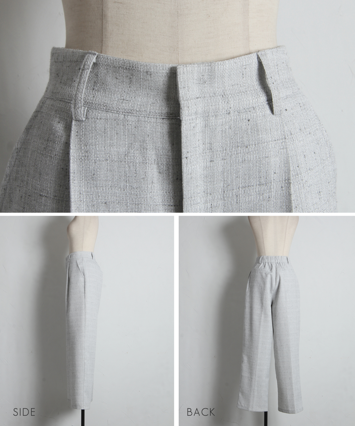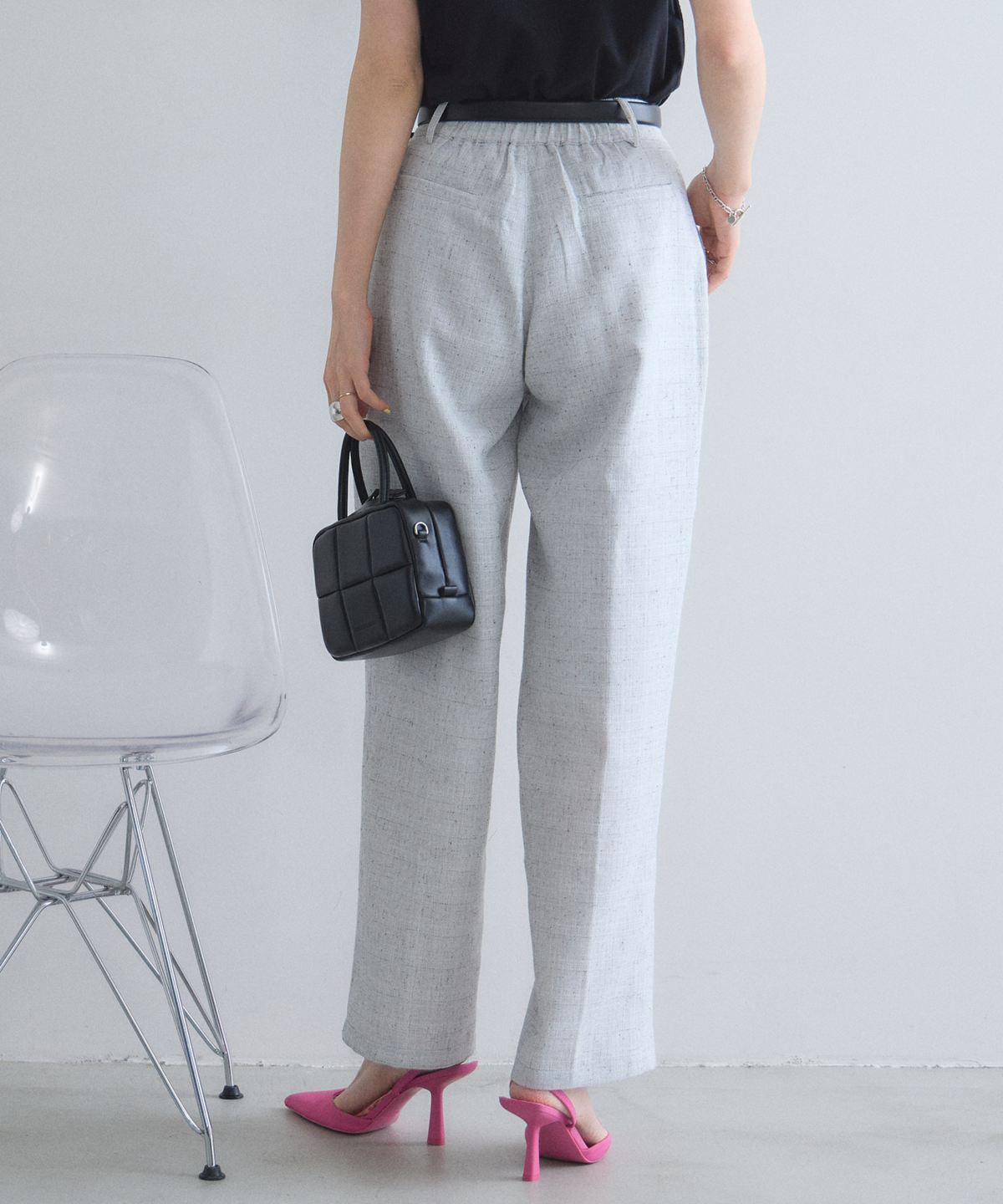 深めに入ったタックが腰回りをすっきりと見せつつ、