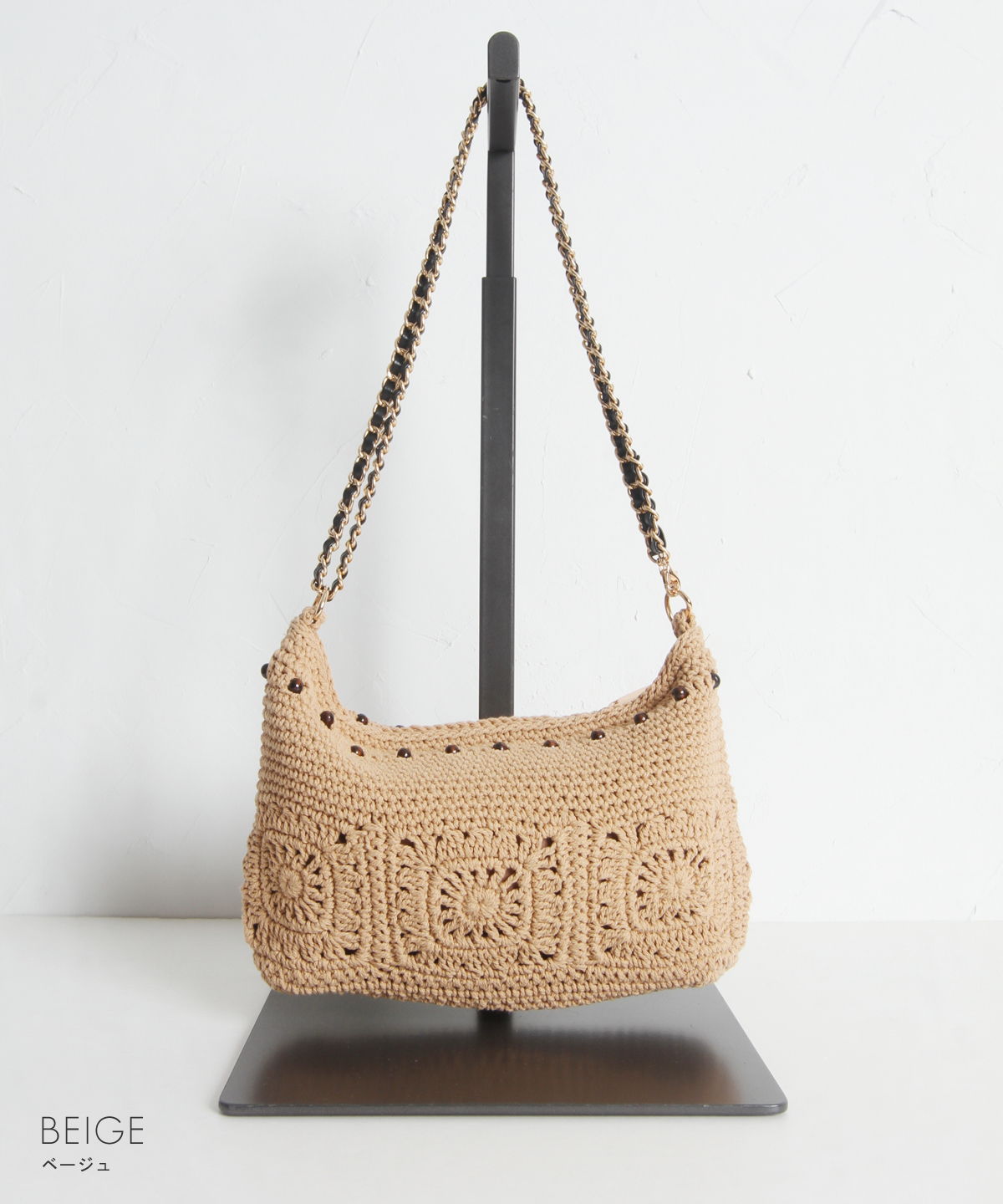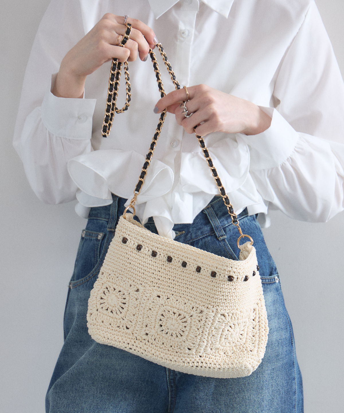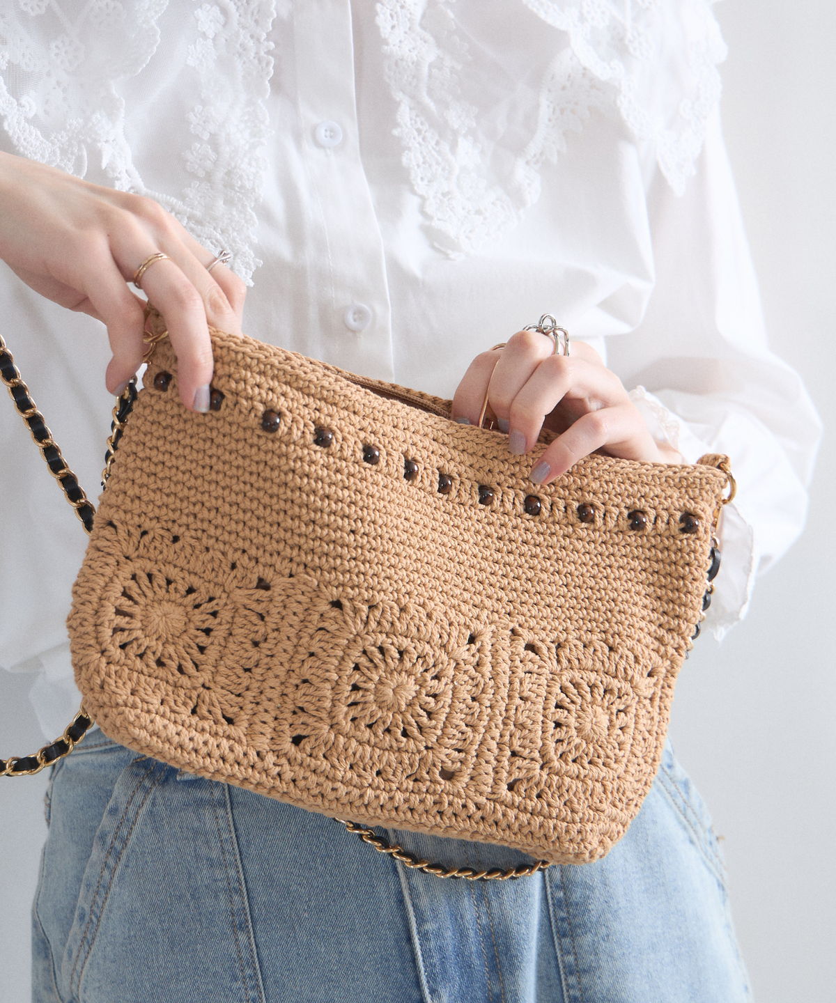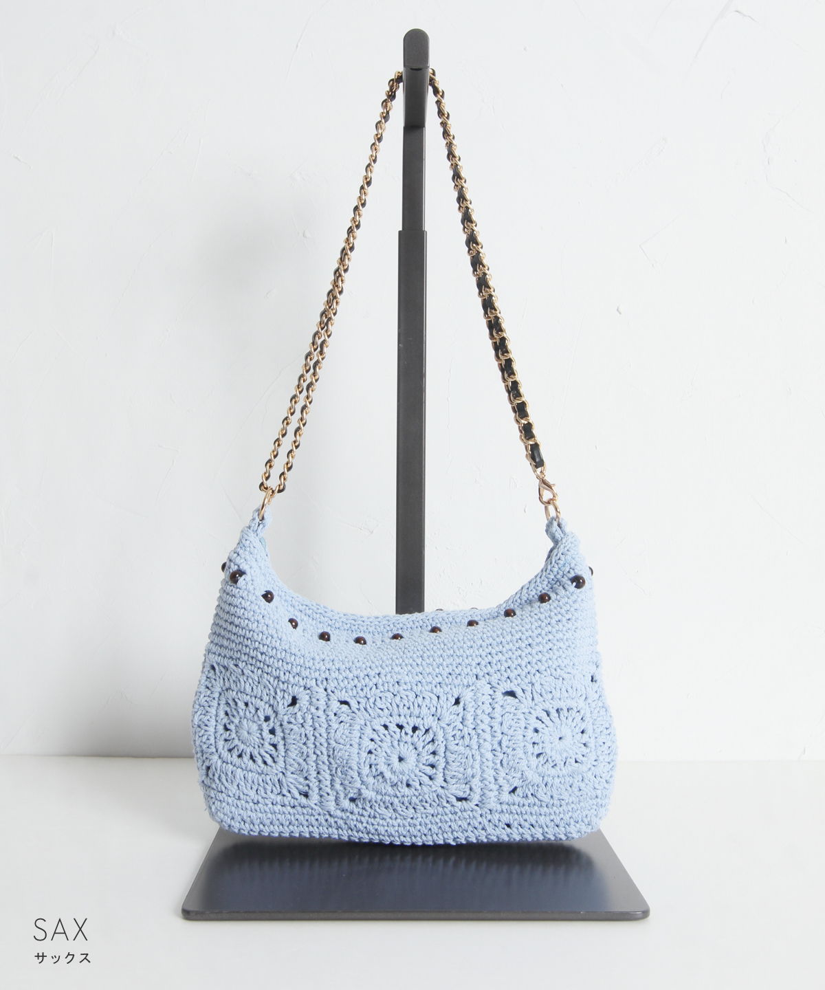 温かみのあるクロシェ編みが主役の、表情豊かなショルダーバッグです。