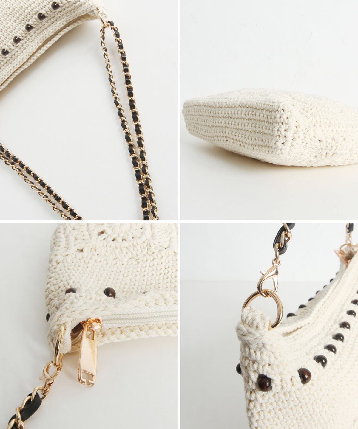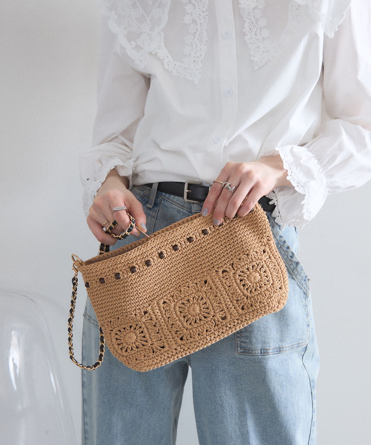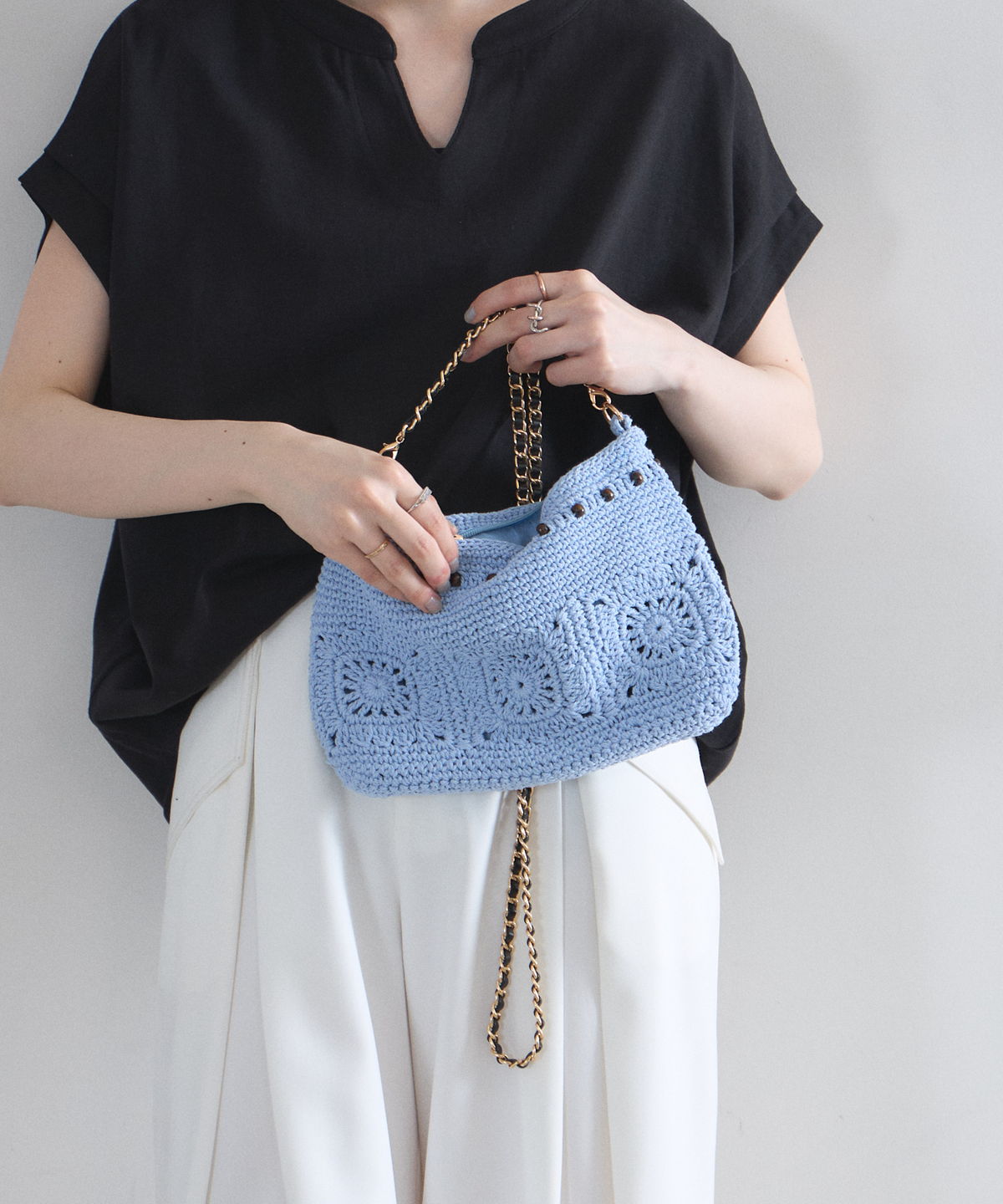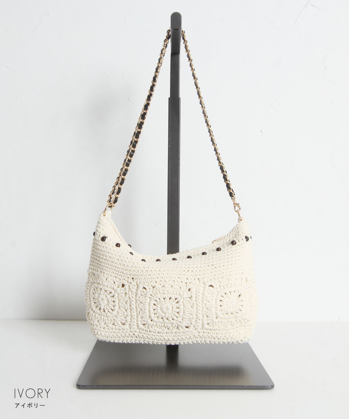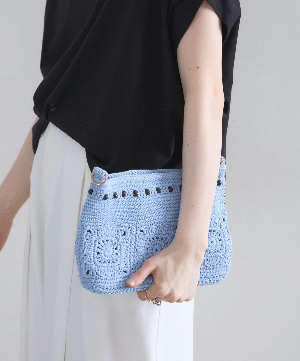 温かみのあるクロシェ編みが主役の、表情豊かなショルダーバッグです。