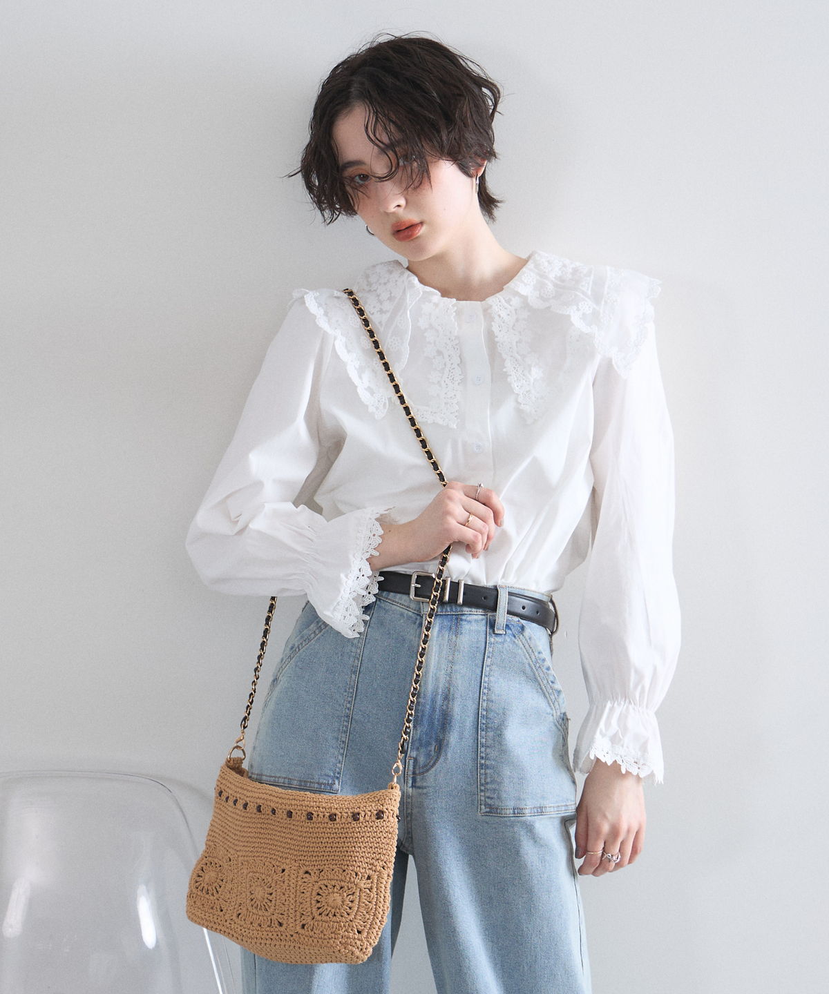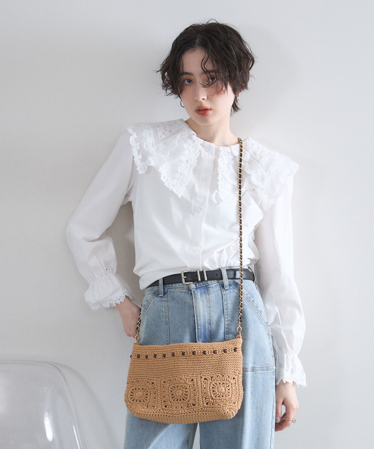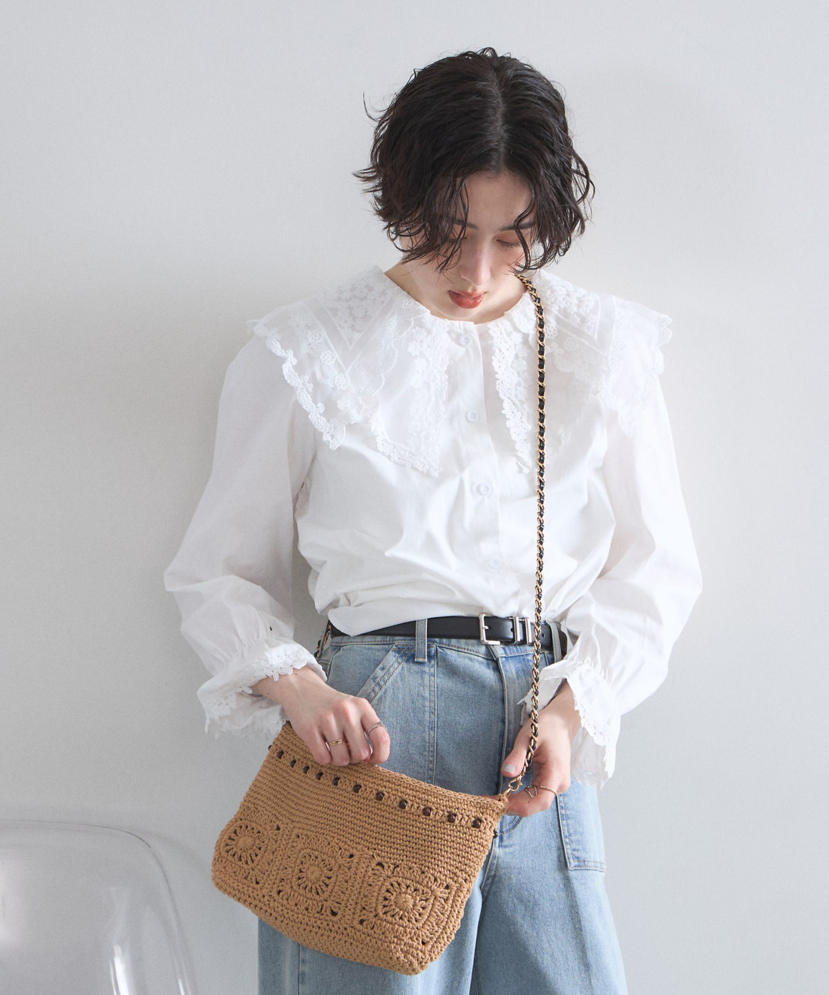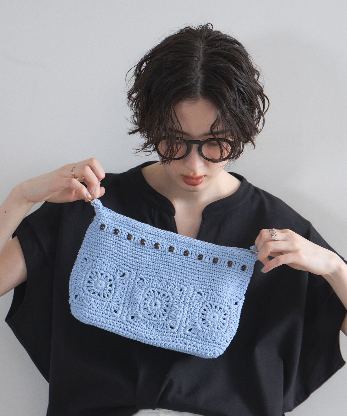 温かみのあるクロシェ編みが主役の、表情豊かなショルダーバッグです。