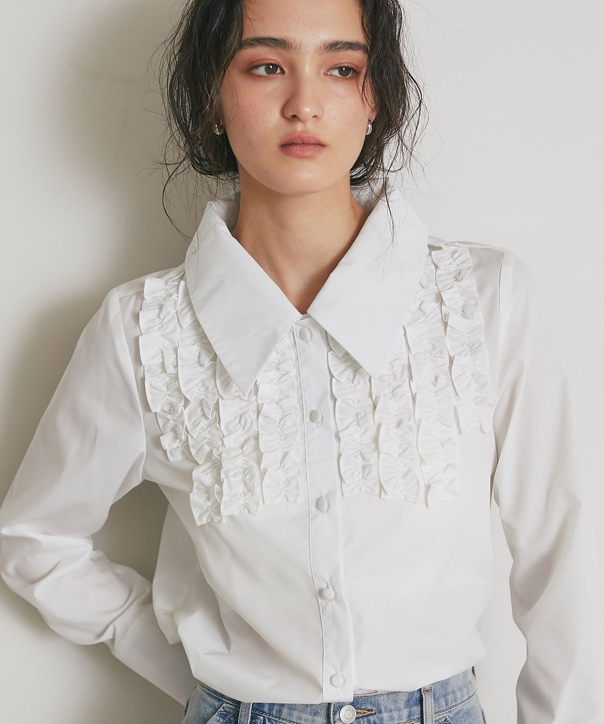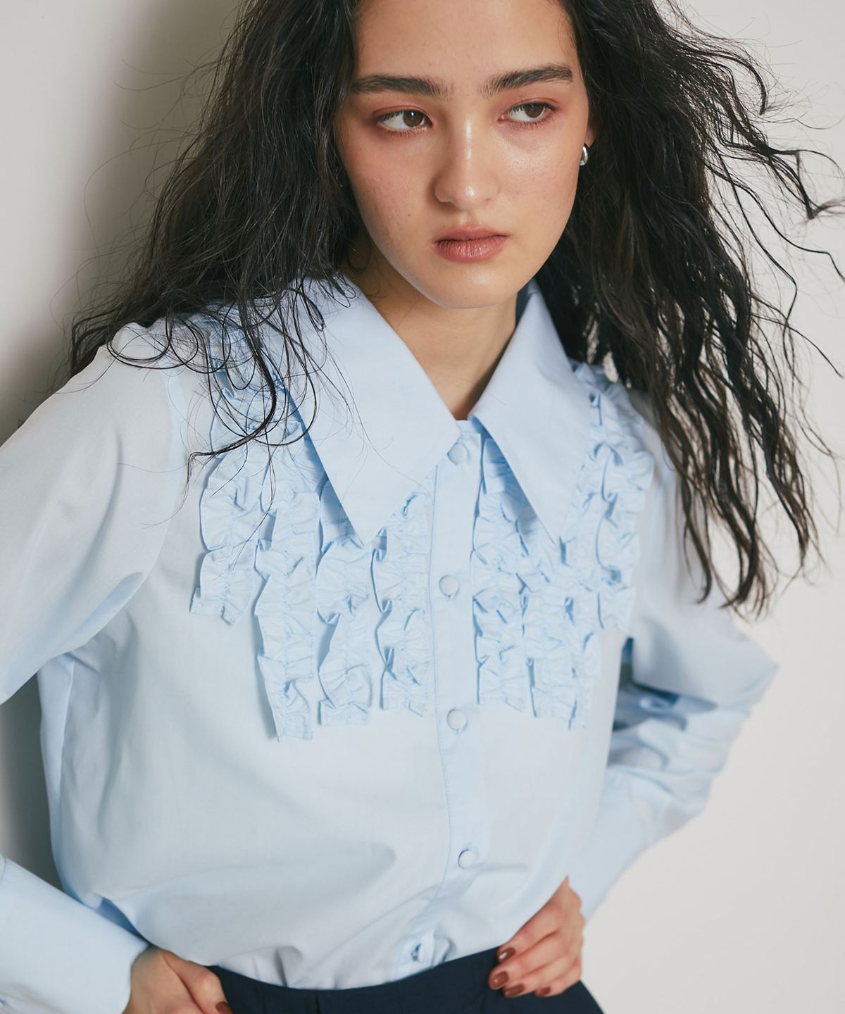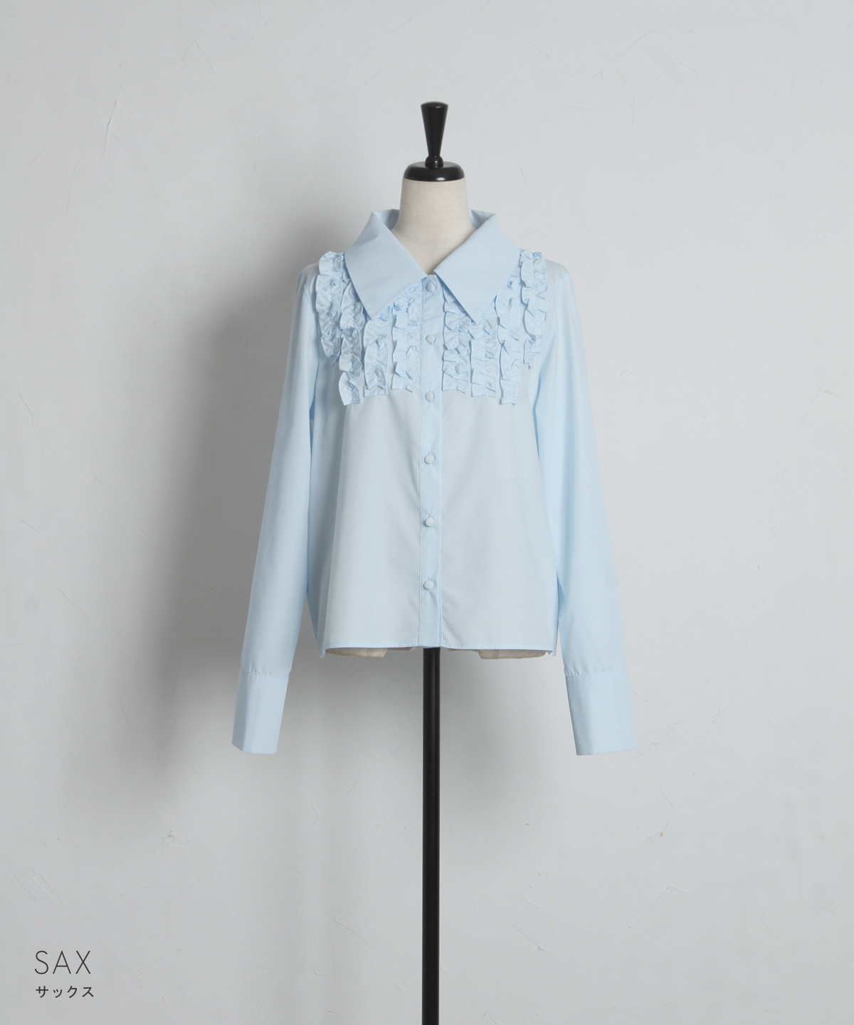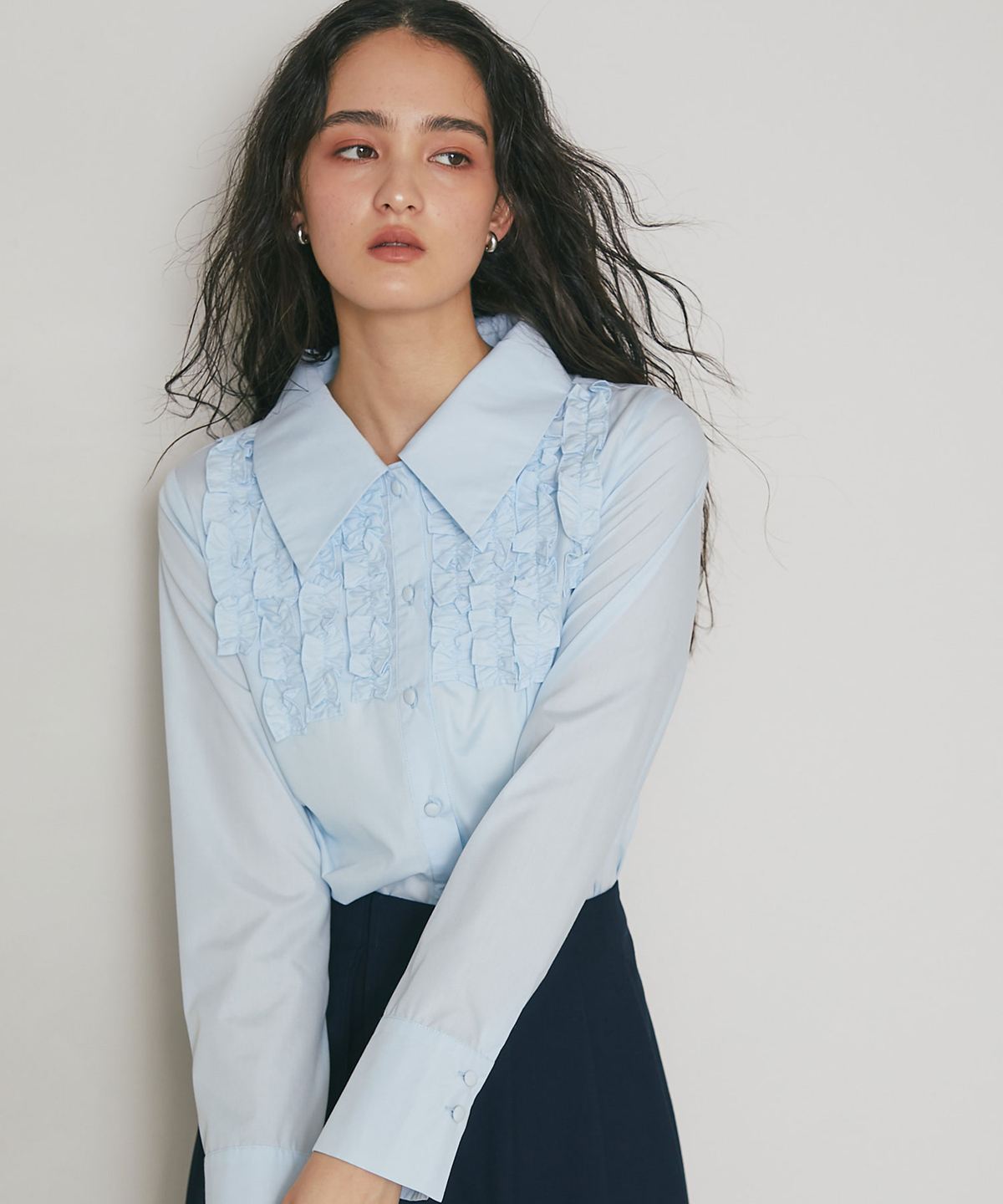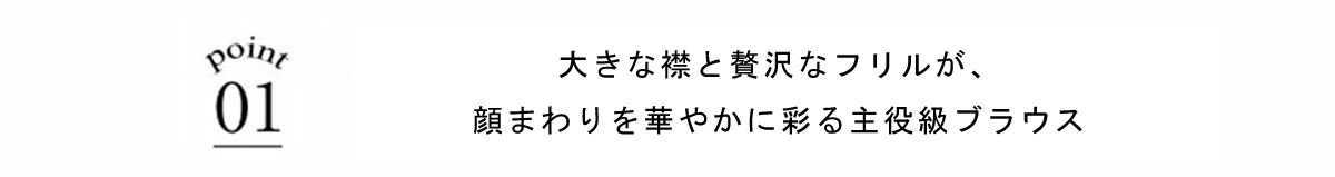 大きな襟と贅沢なフリルが、顔まわりを華やかに彩る主役級ブラウス。