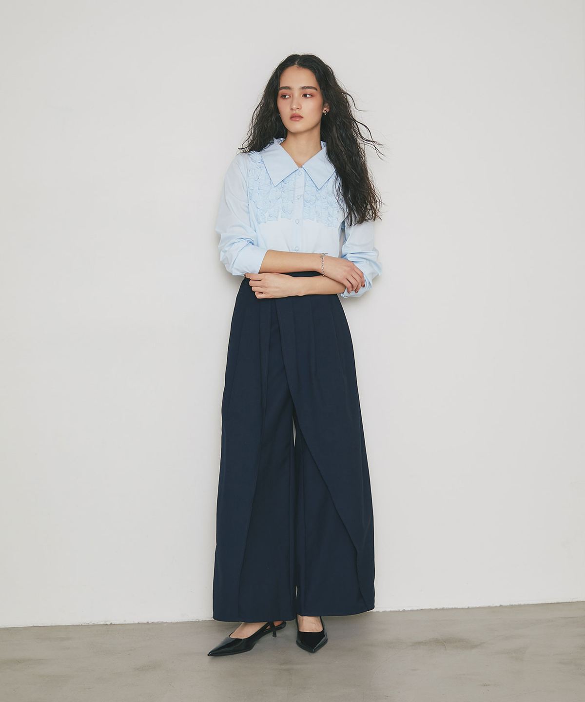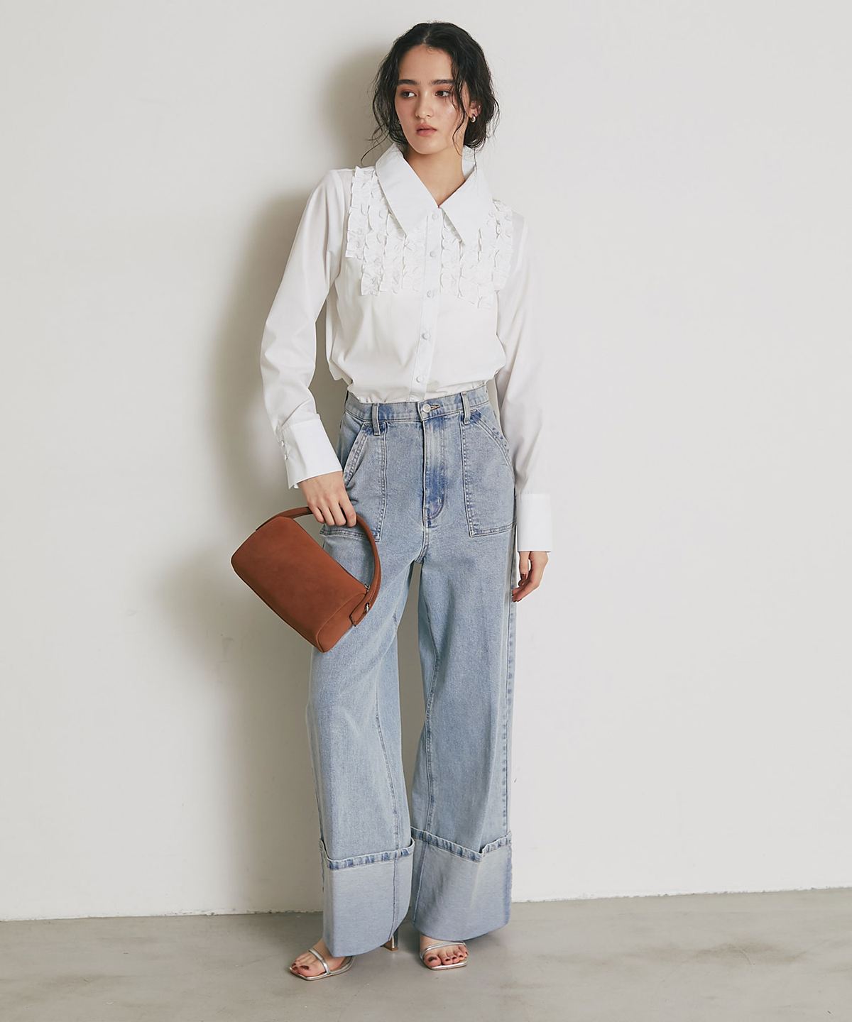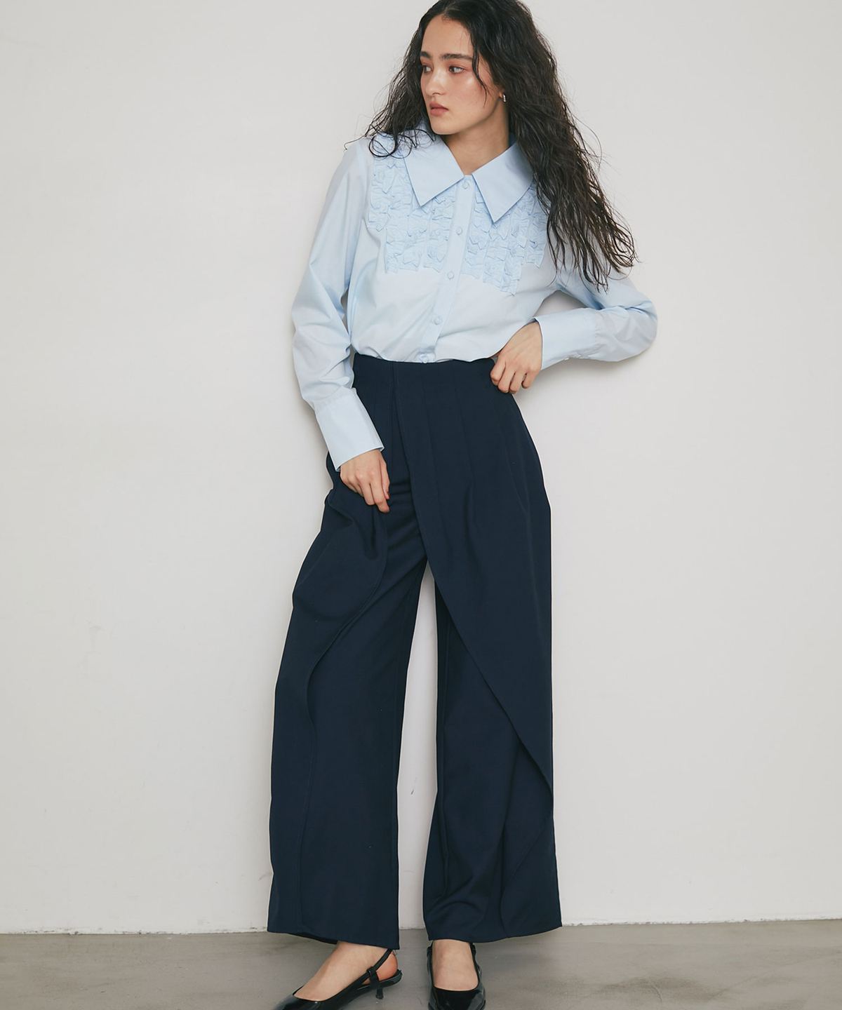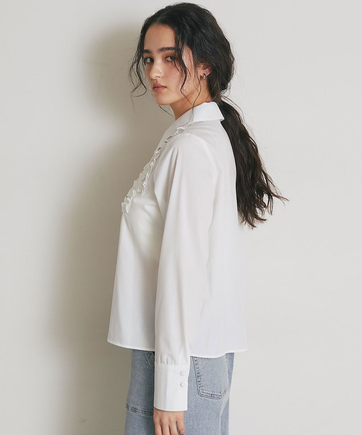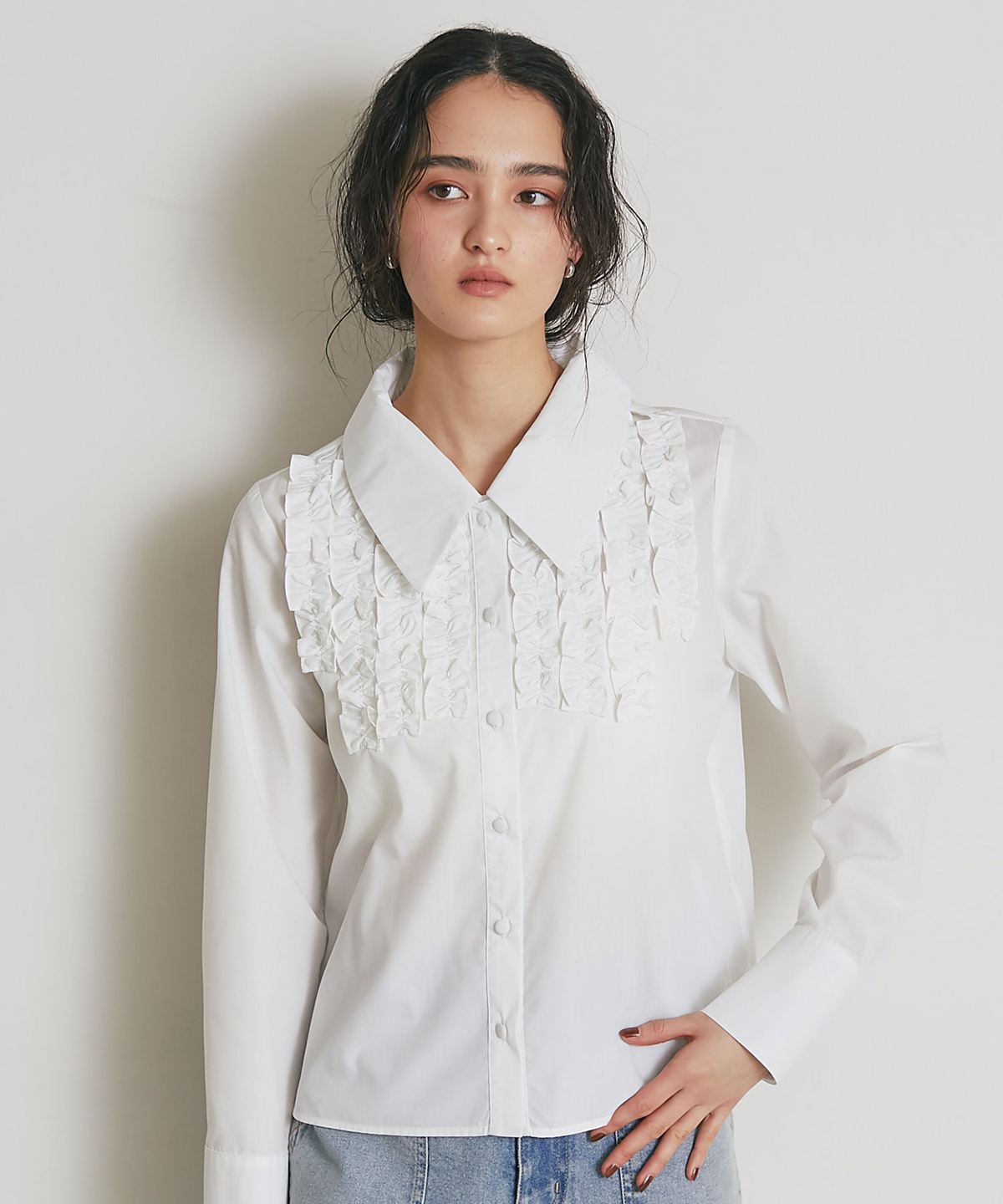 大きな襟と贅沢なフリルが、顔まわりを華やかに彩る主役級ブラウス。