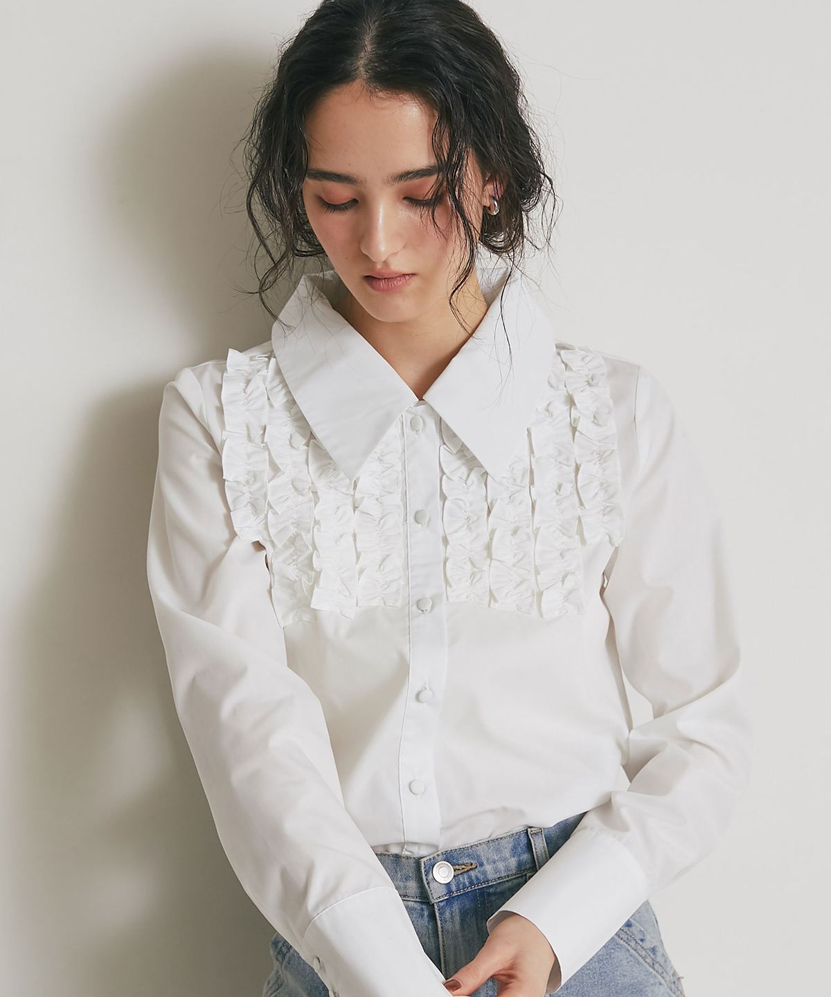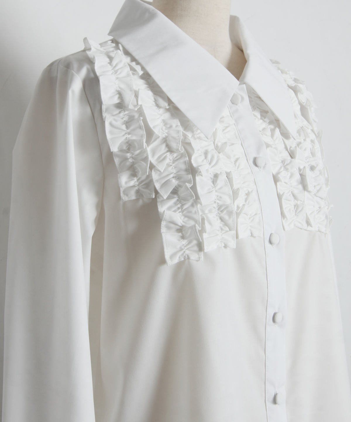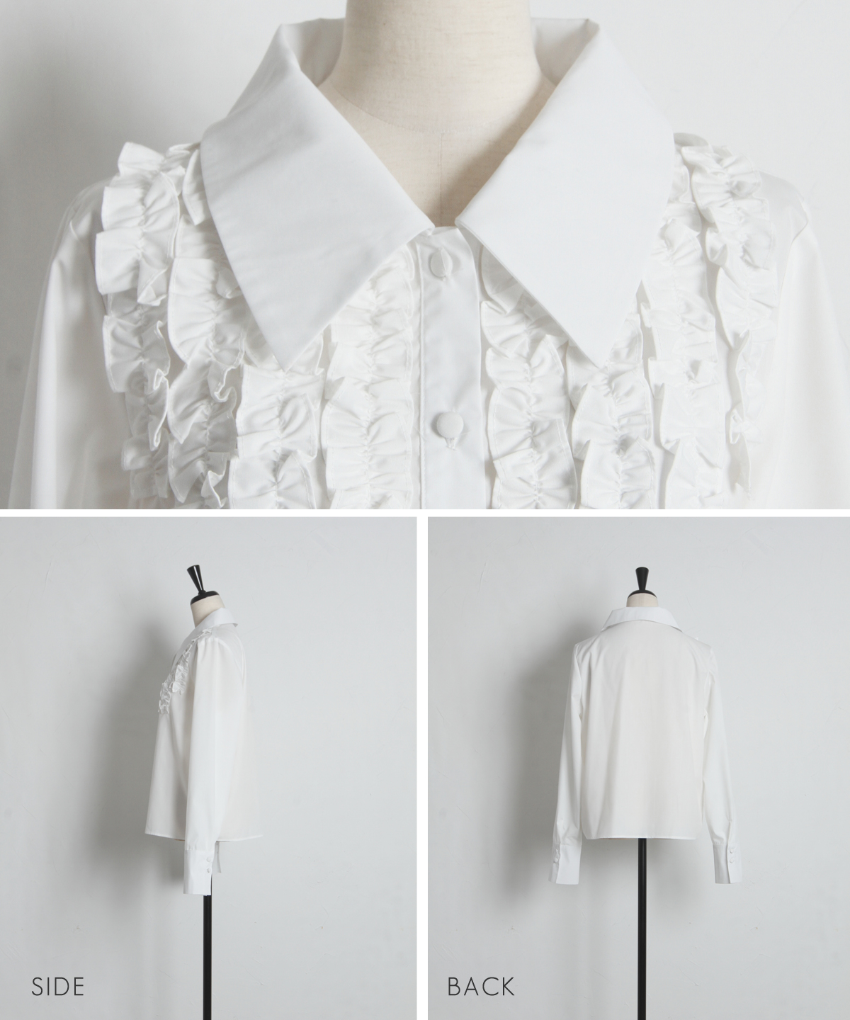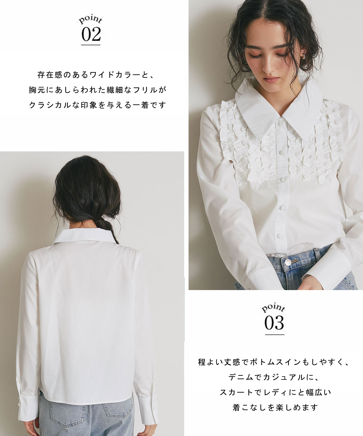 存在感のあるワイドカラーと、胸元にあしらわれた繊細なフリルがクラシカルな印象を与える一着です。