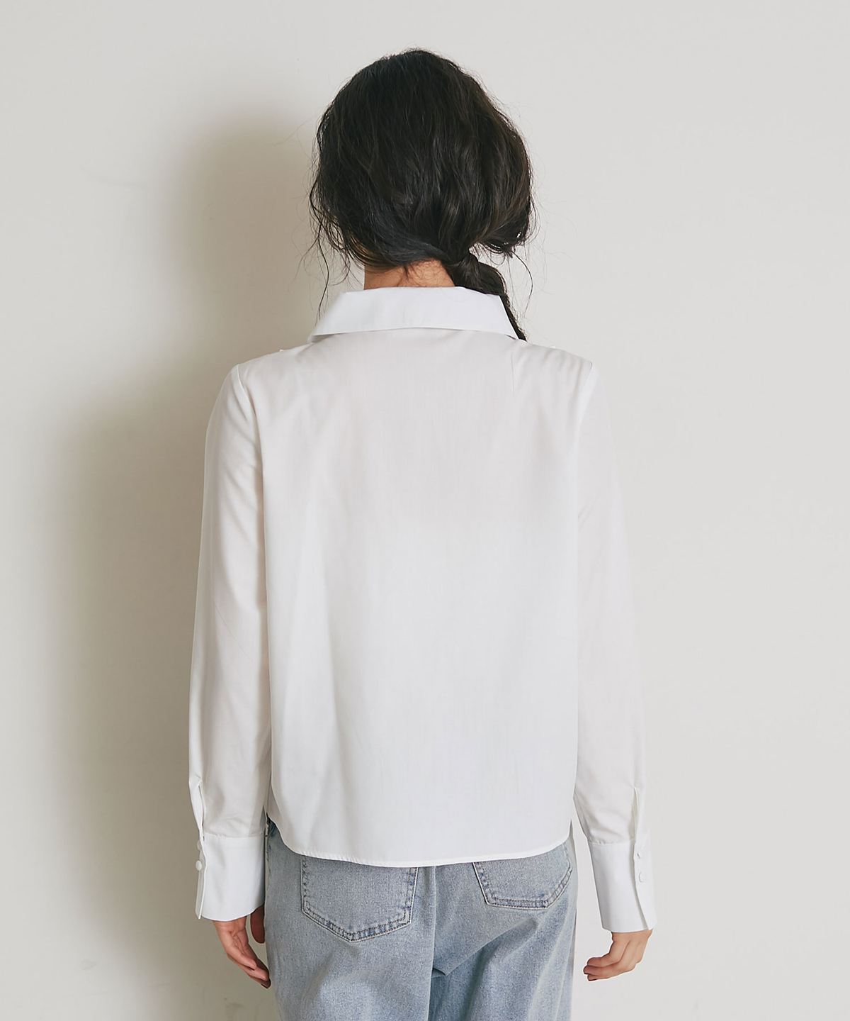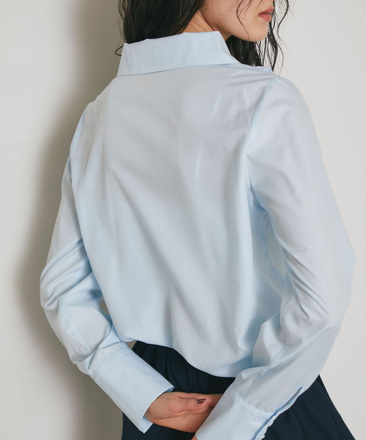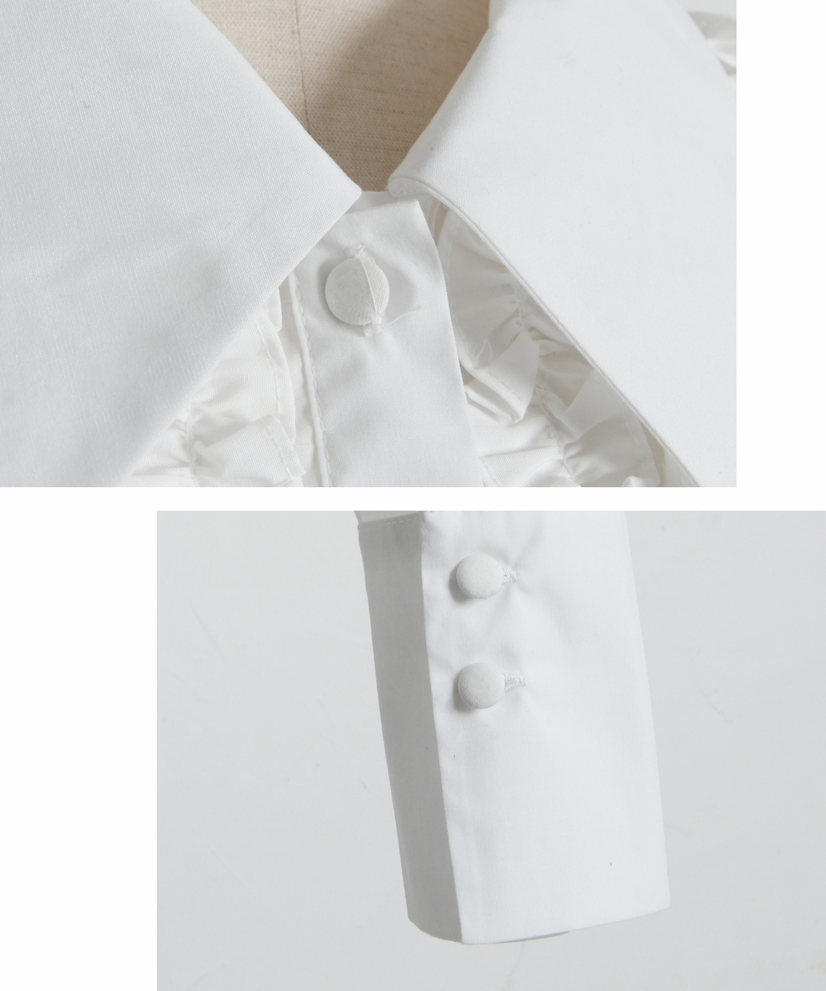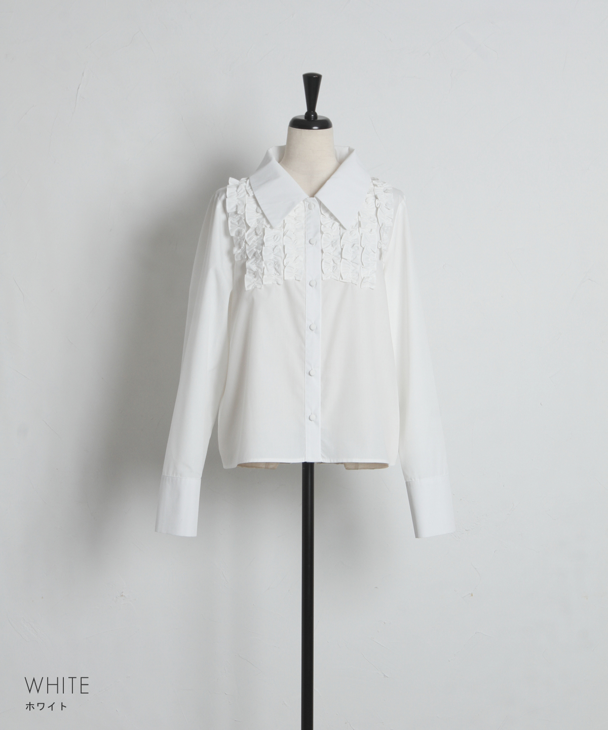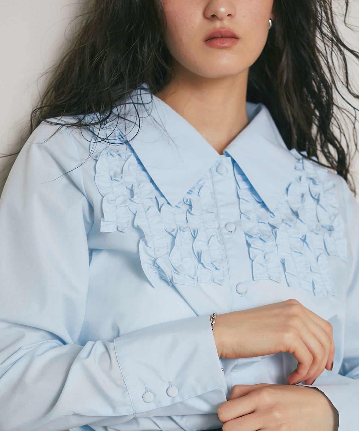 存在感のあるワイドカラーと、胸元にあしらわれた繊細なフリルがクラシカルな印象を与える一着です。