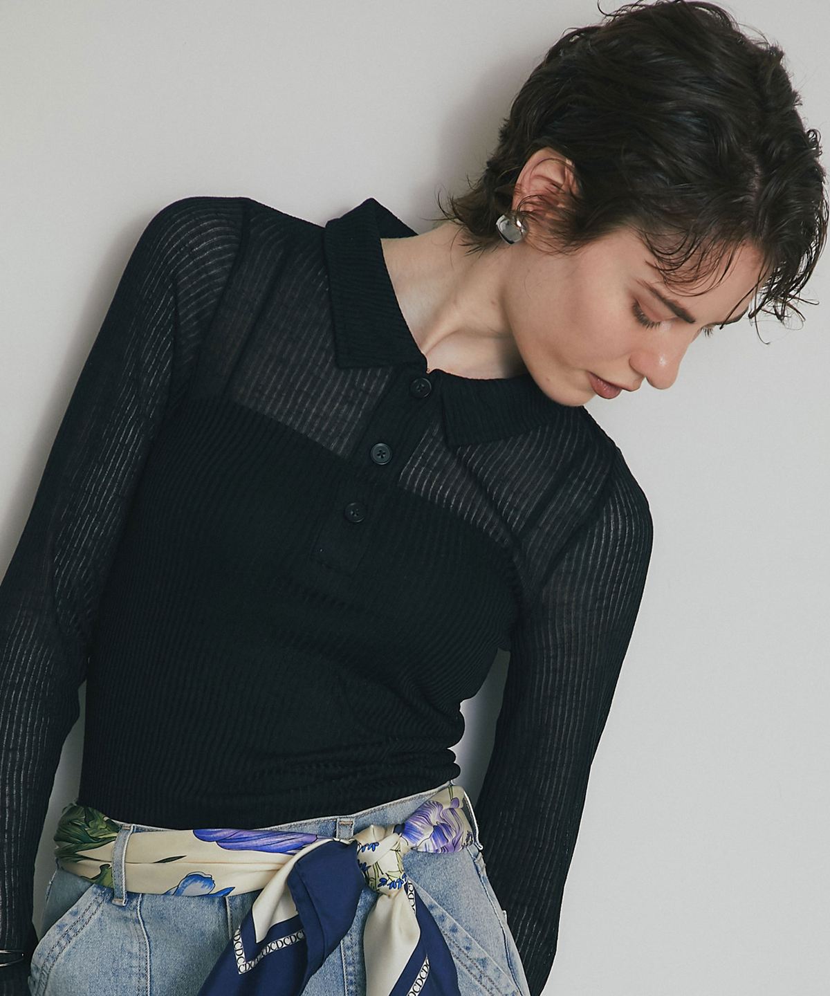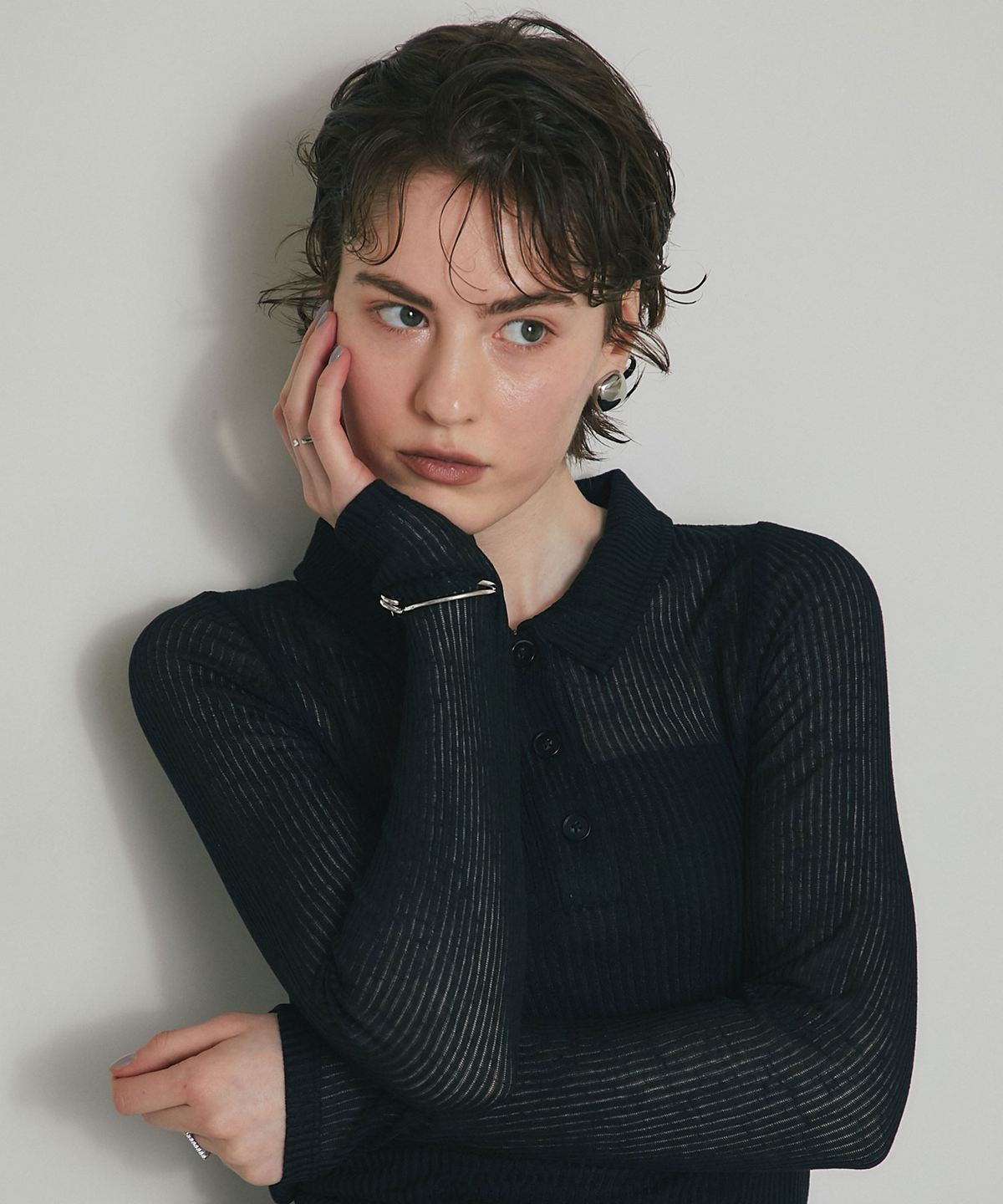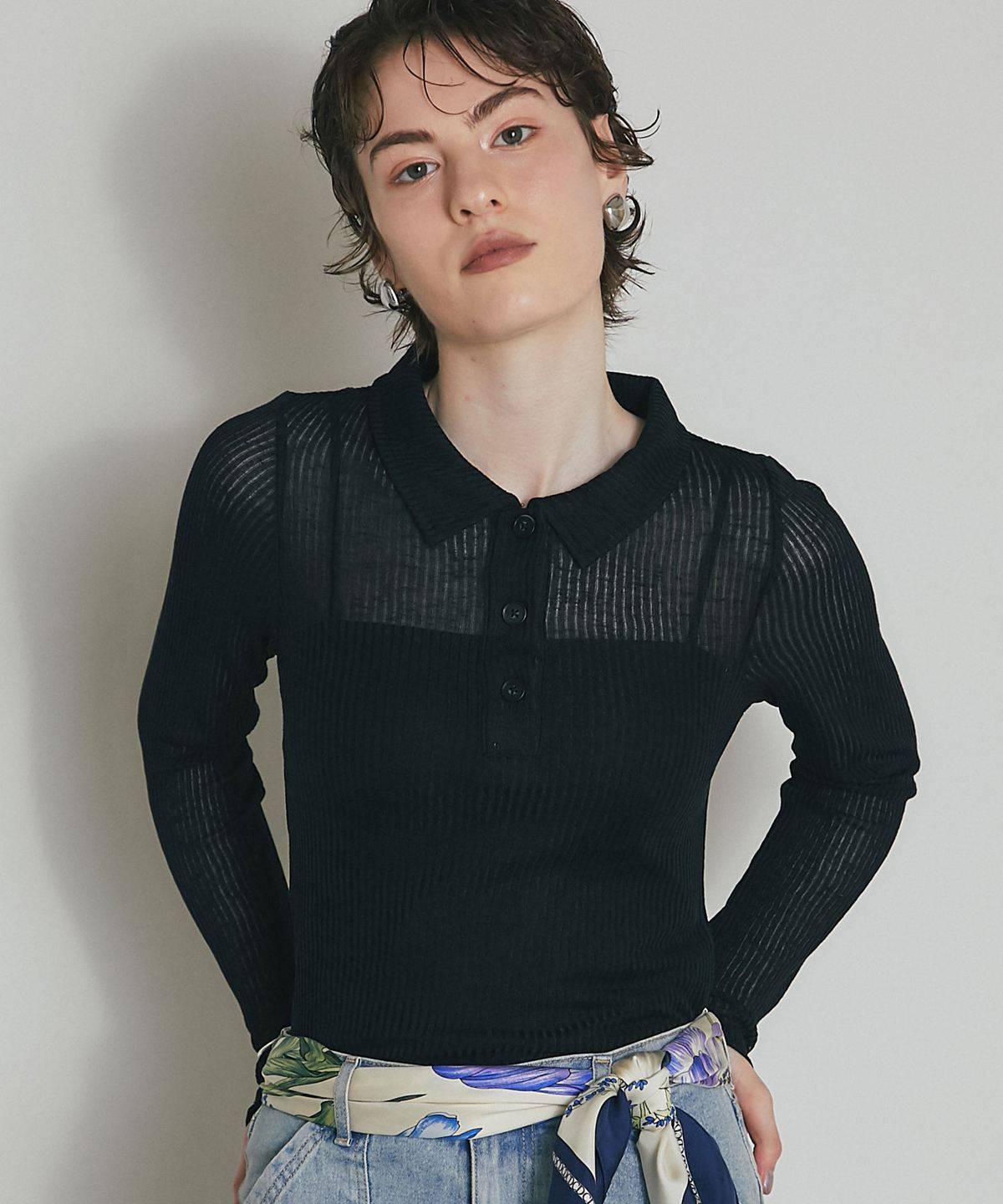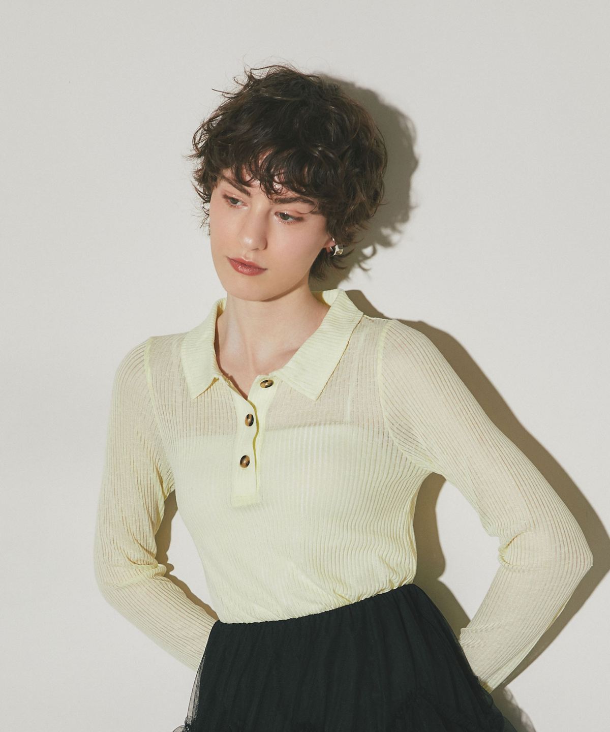 繊細なリブ編みのシアー素材を使用した、今季らしい抜け感漂うポロトップス。