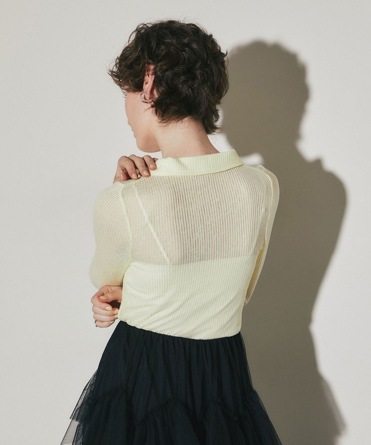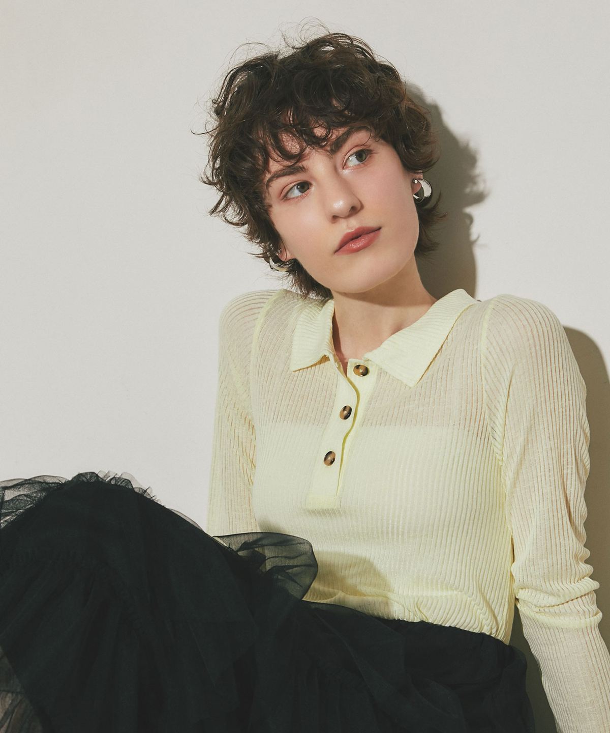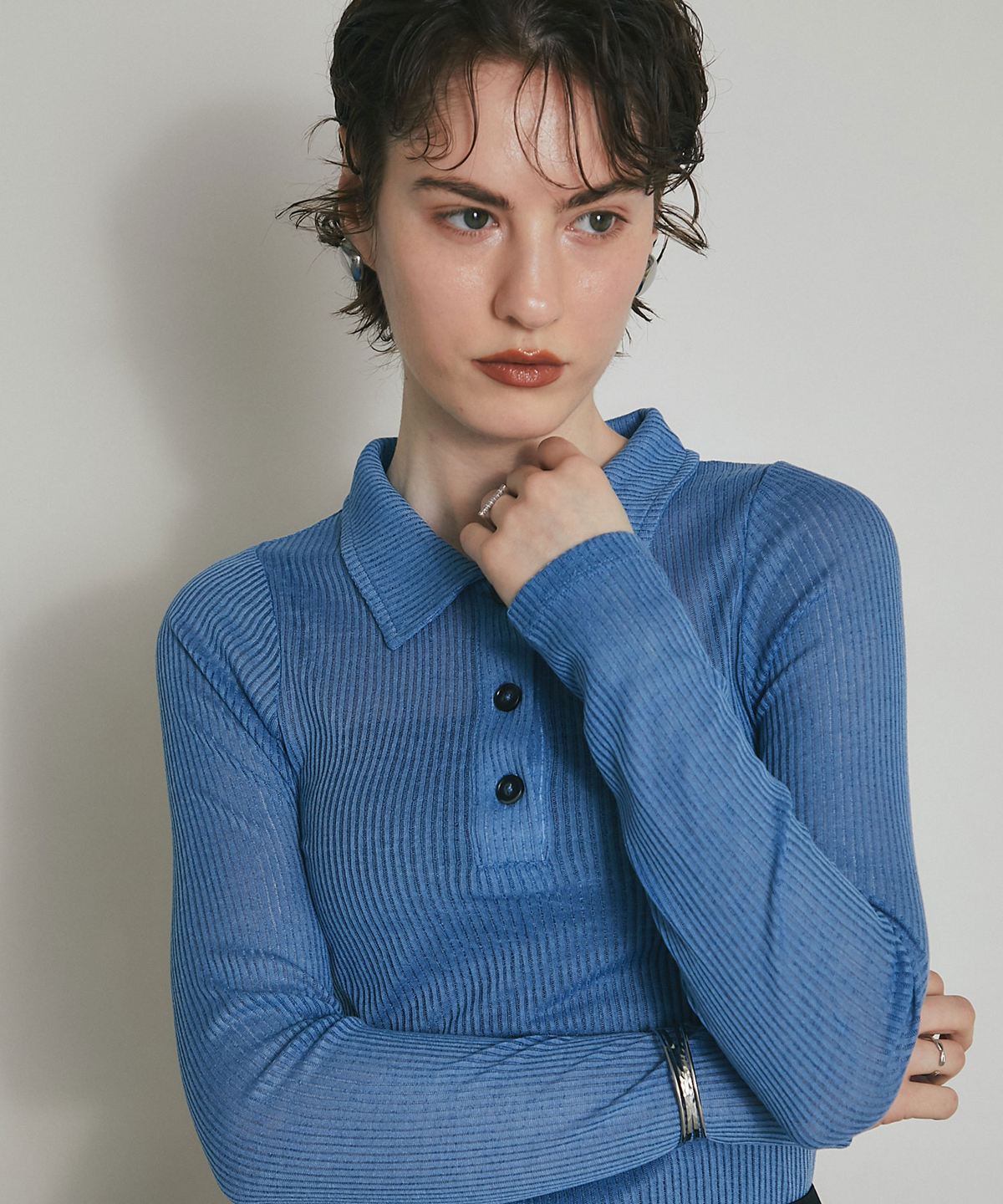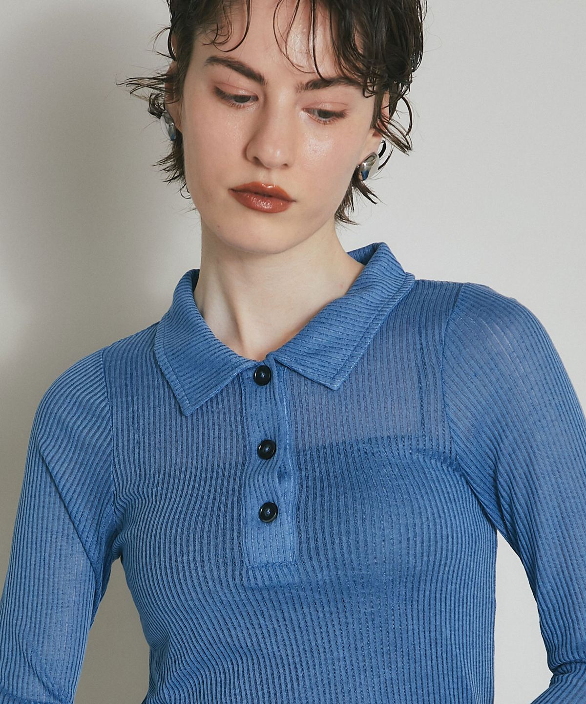 繊細なリブ編みのシアー素材を使用した、今季らしい抜け感漂うポロトップス。