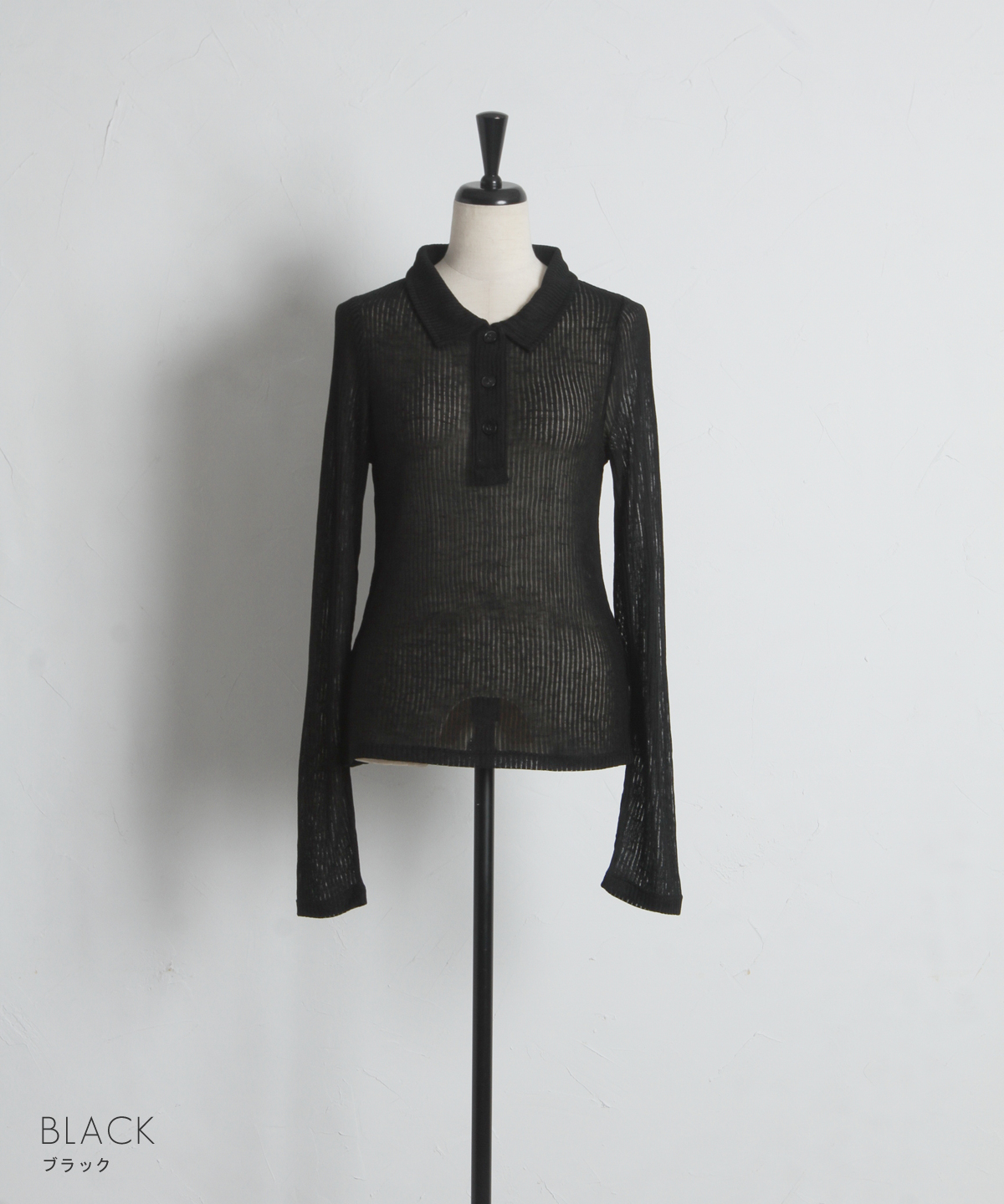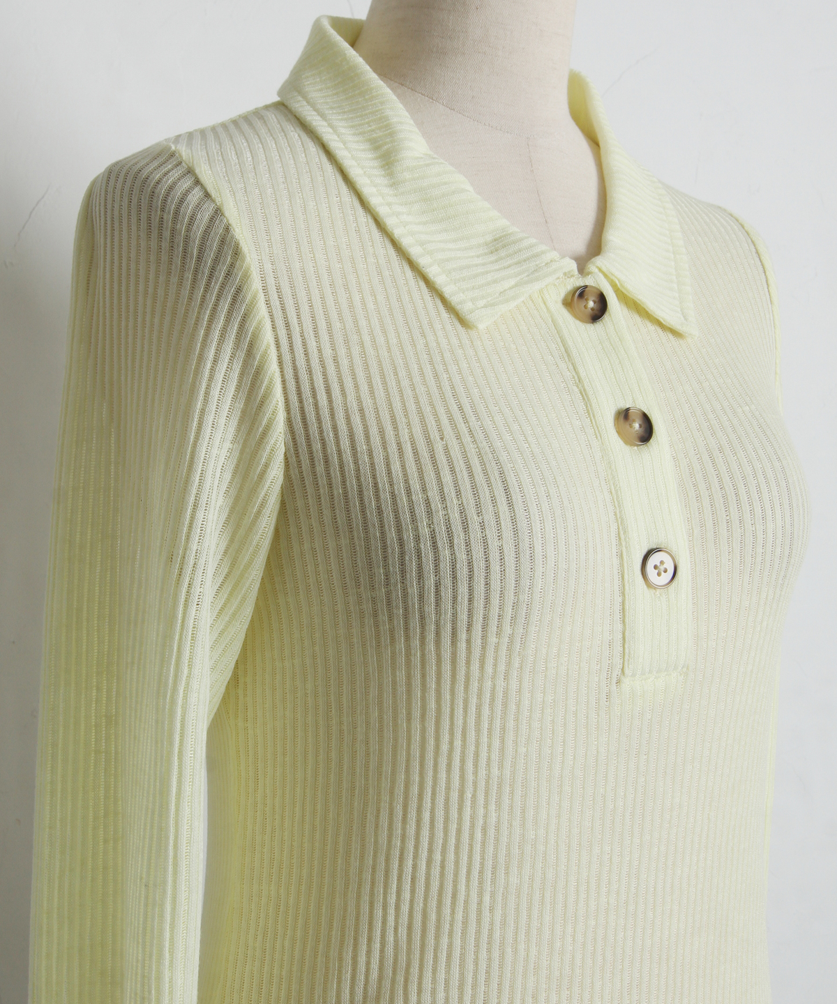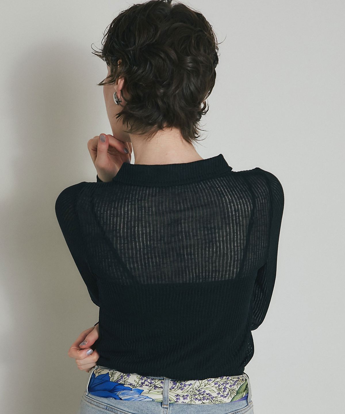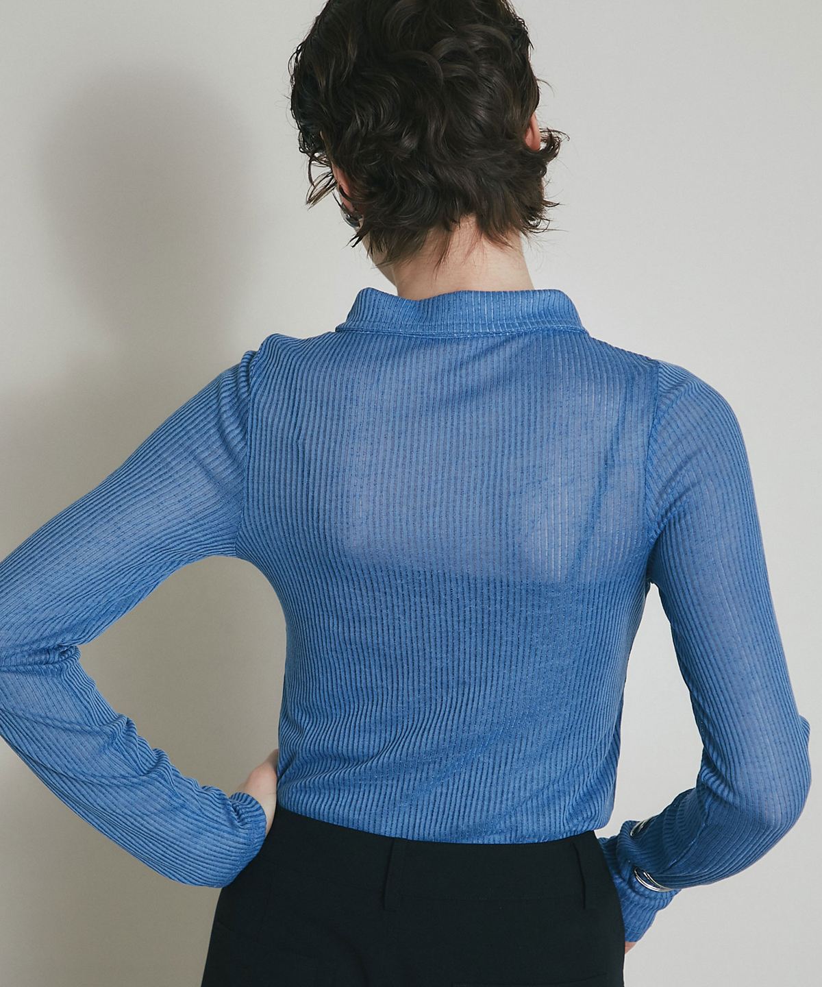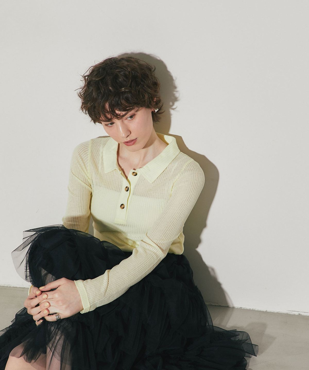 繊細なリブ編みのシアー素材を使用した、今季らしい抜け感漂うポロトップス。