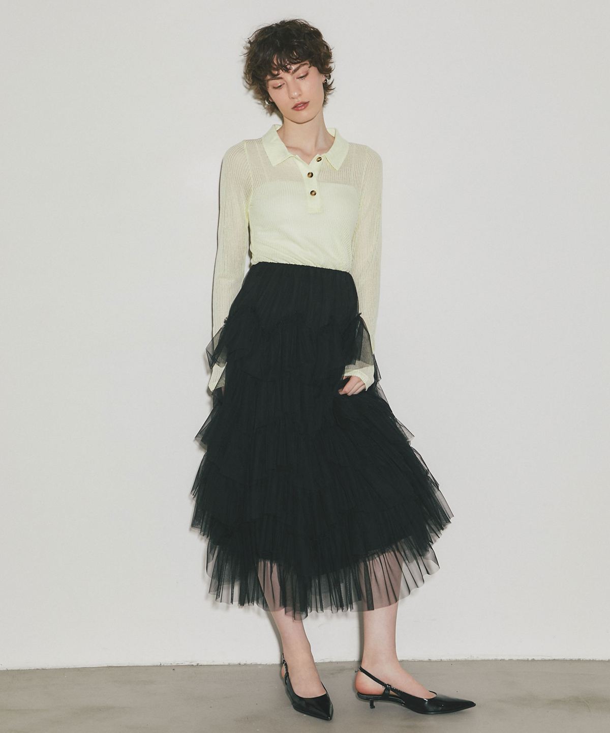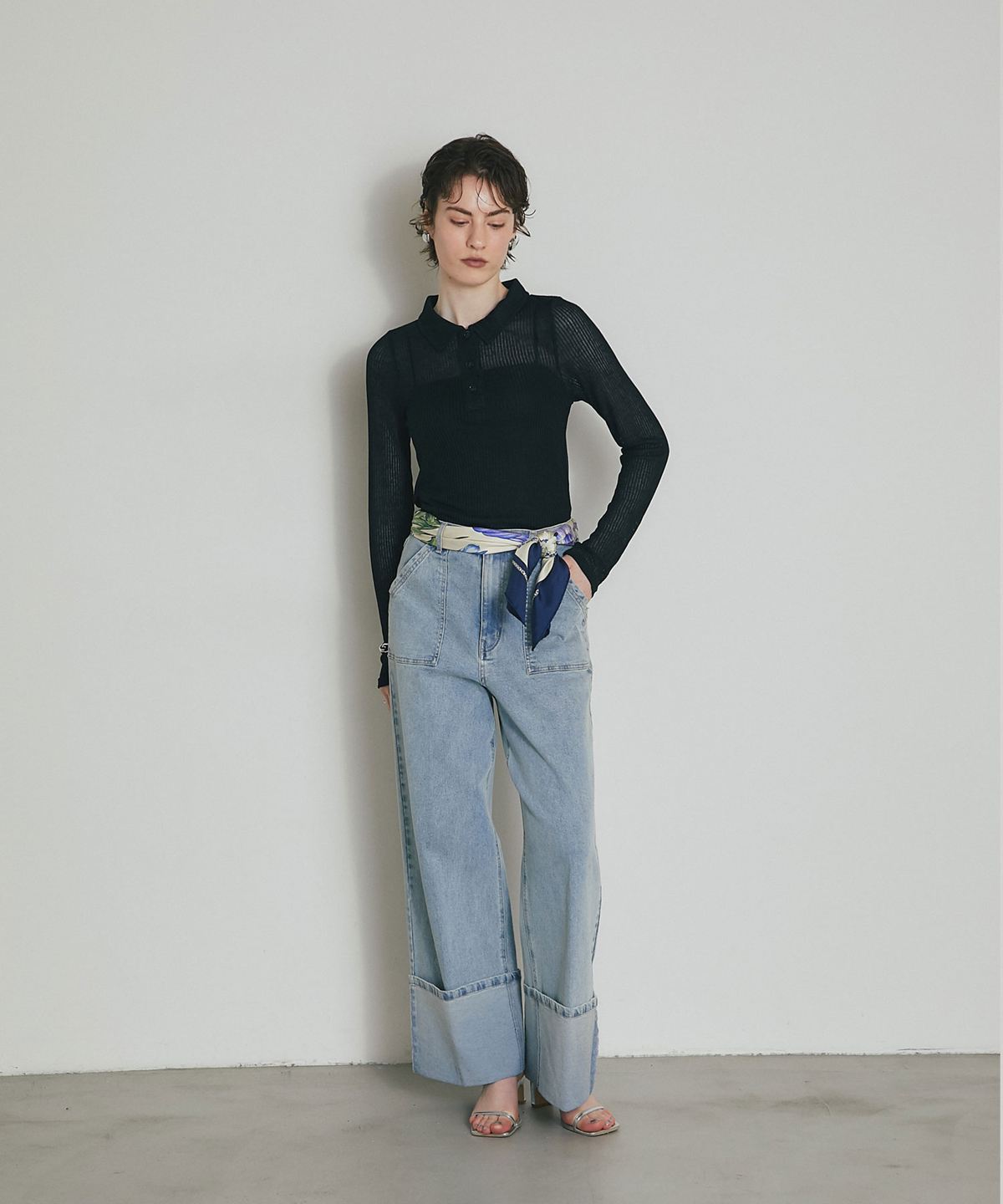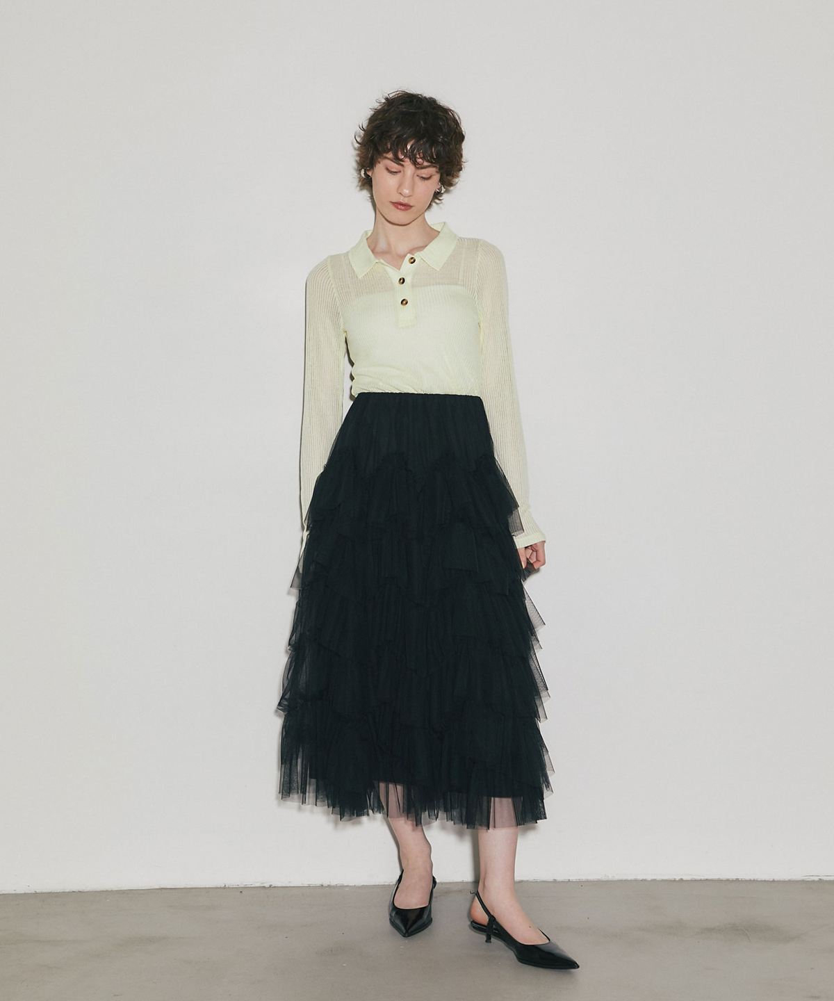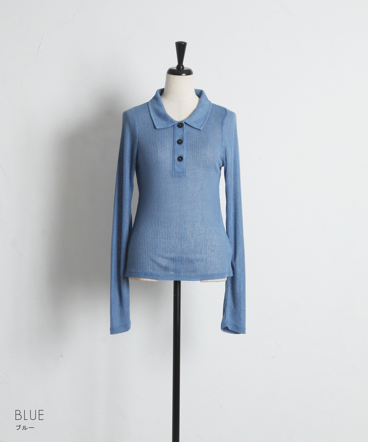 繊細なリブ編みのシアー素材を使用した、今季らしい抜け感漂うポロトップス。