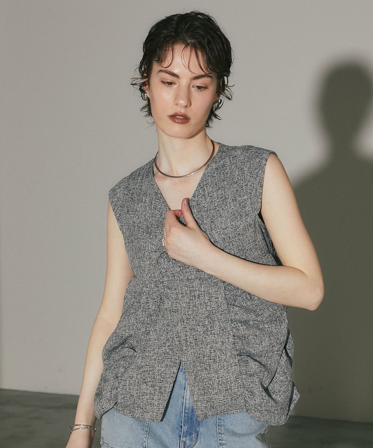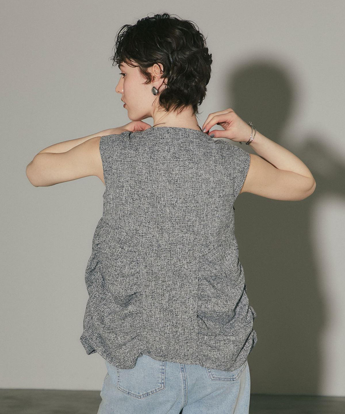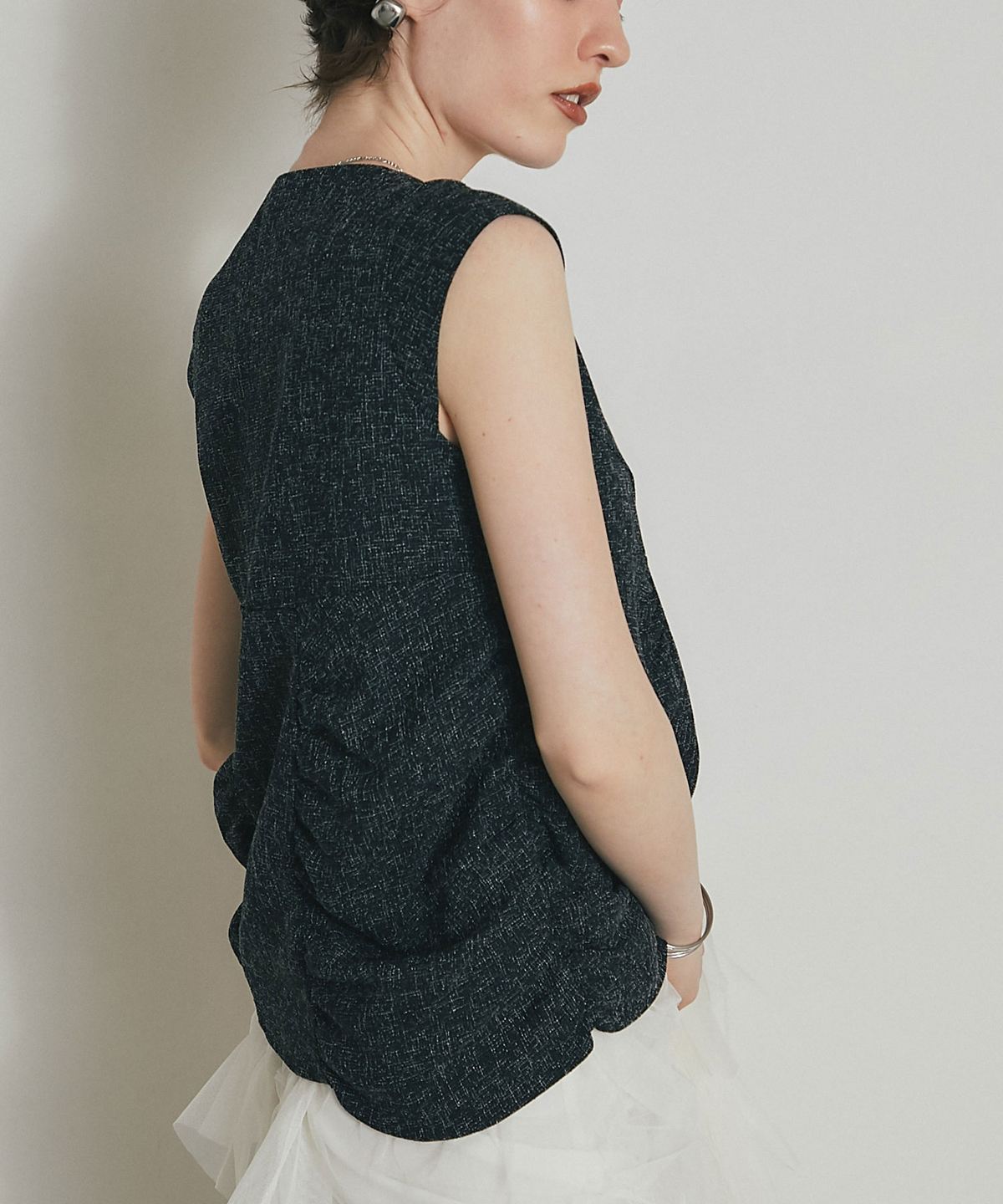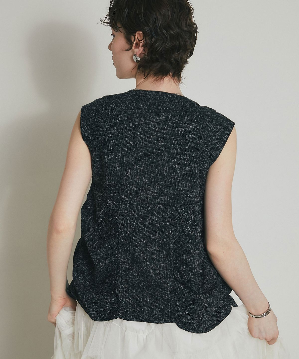 表情豊かなツイード素材を使用した、構築的なシルエットが魅力のトップス。