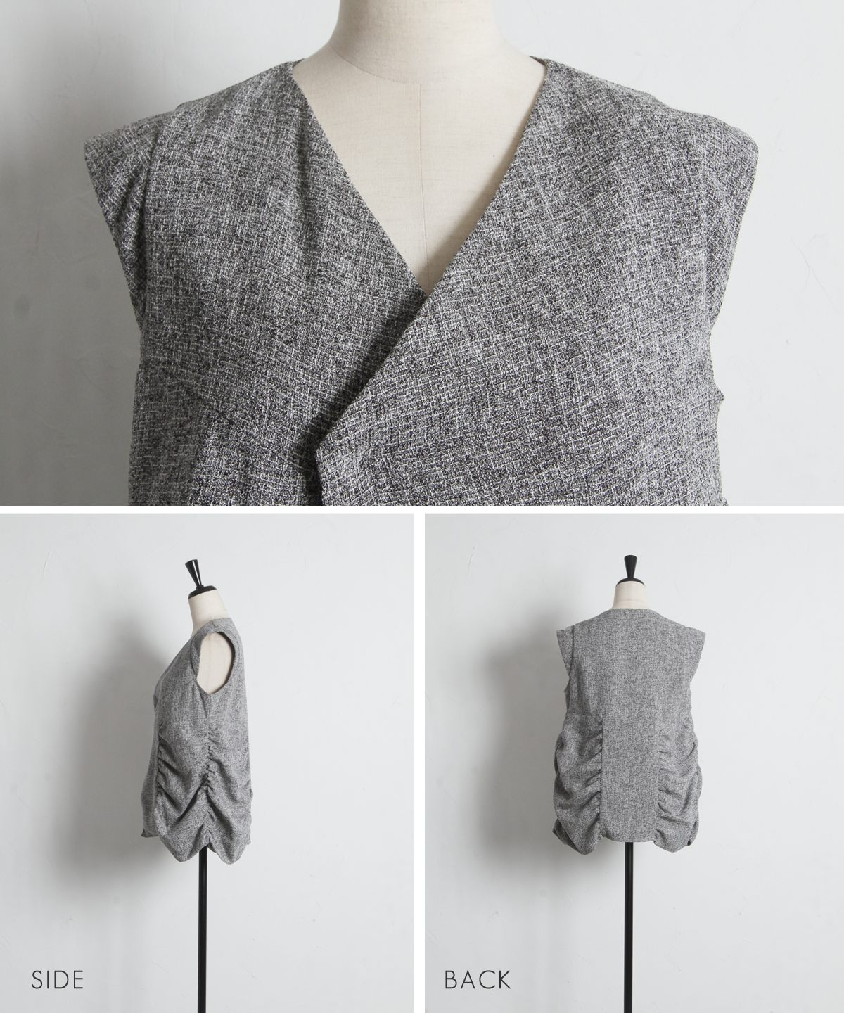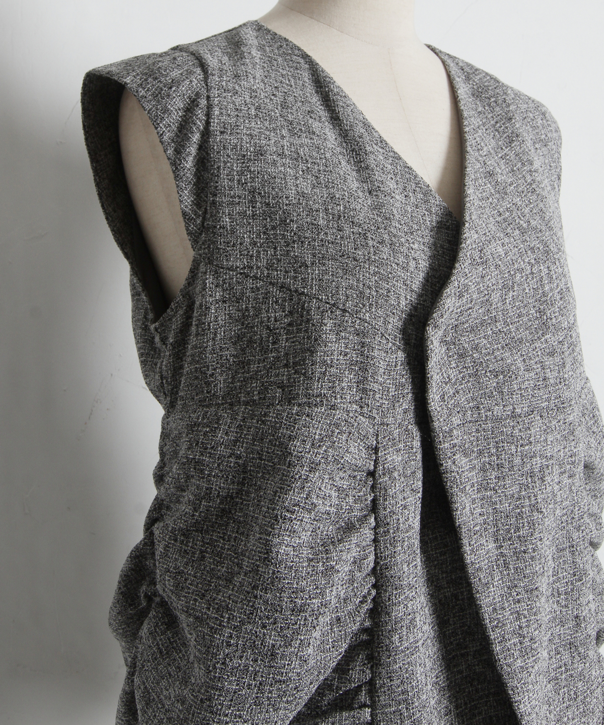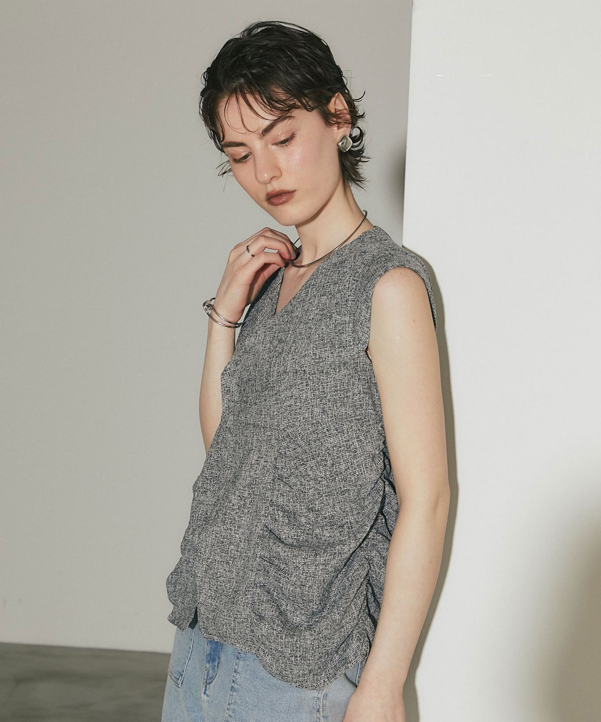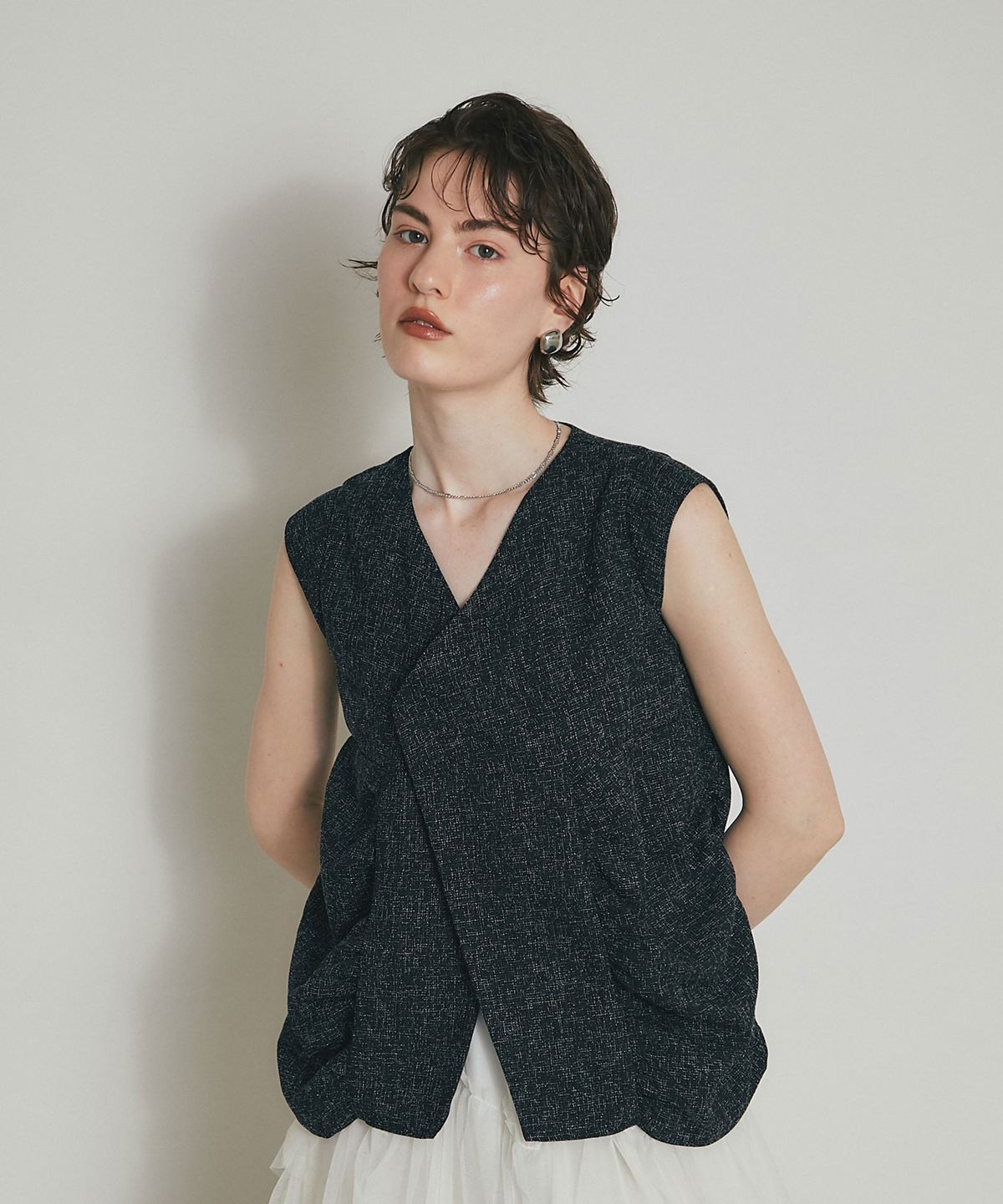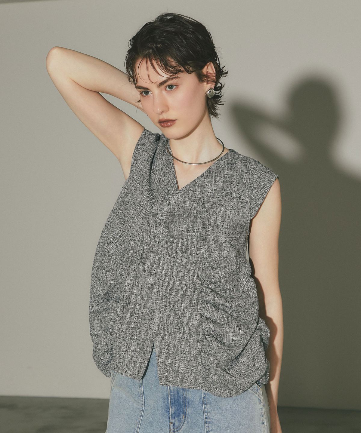 表情豊かなツイード素材を使用した、構築的なシルエットが魅力のトップス。