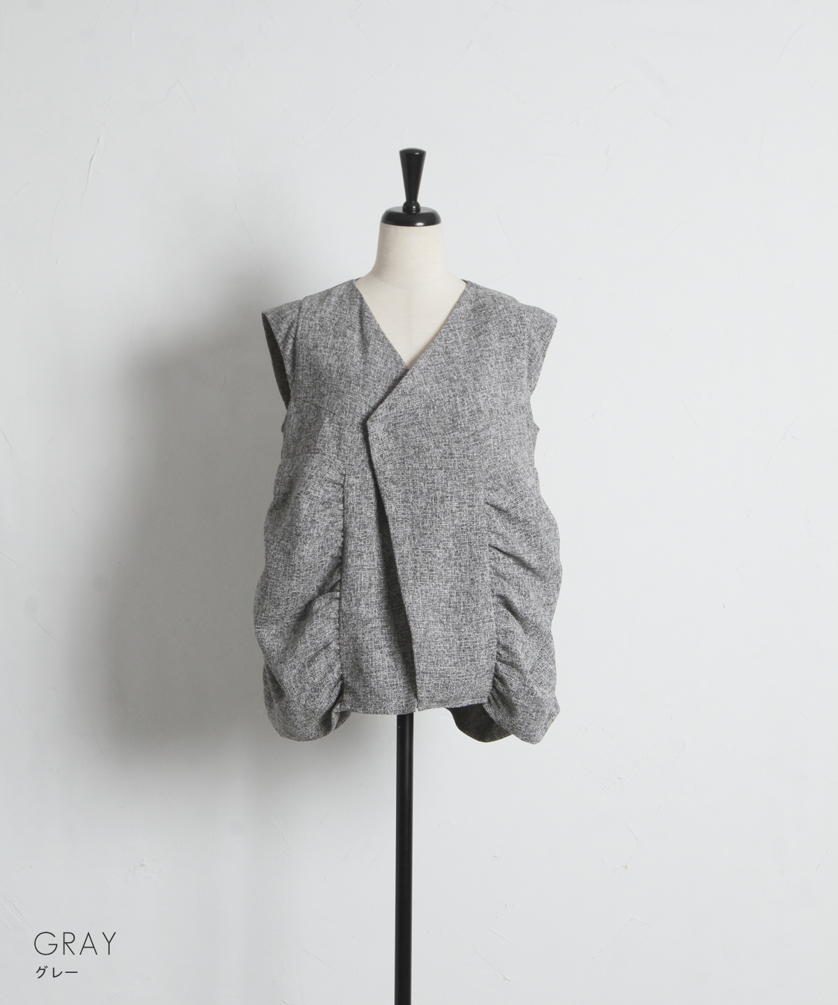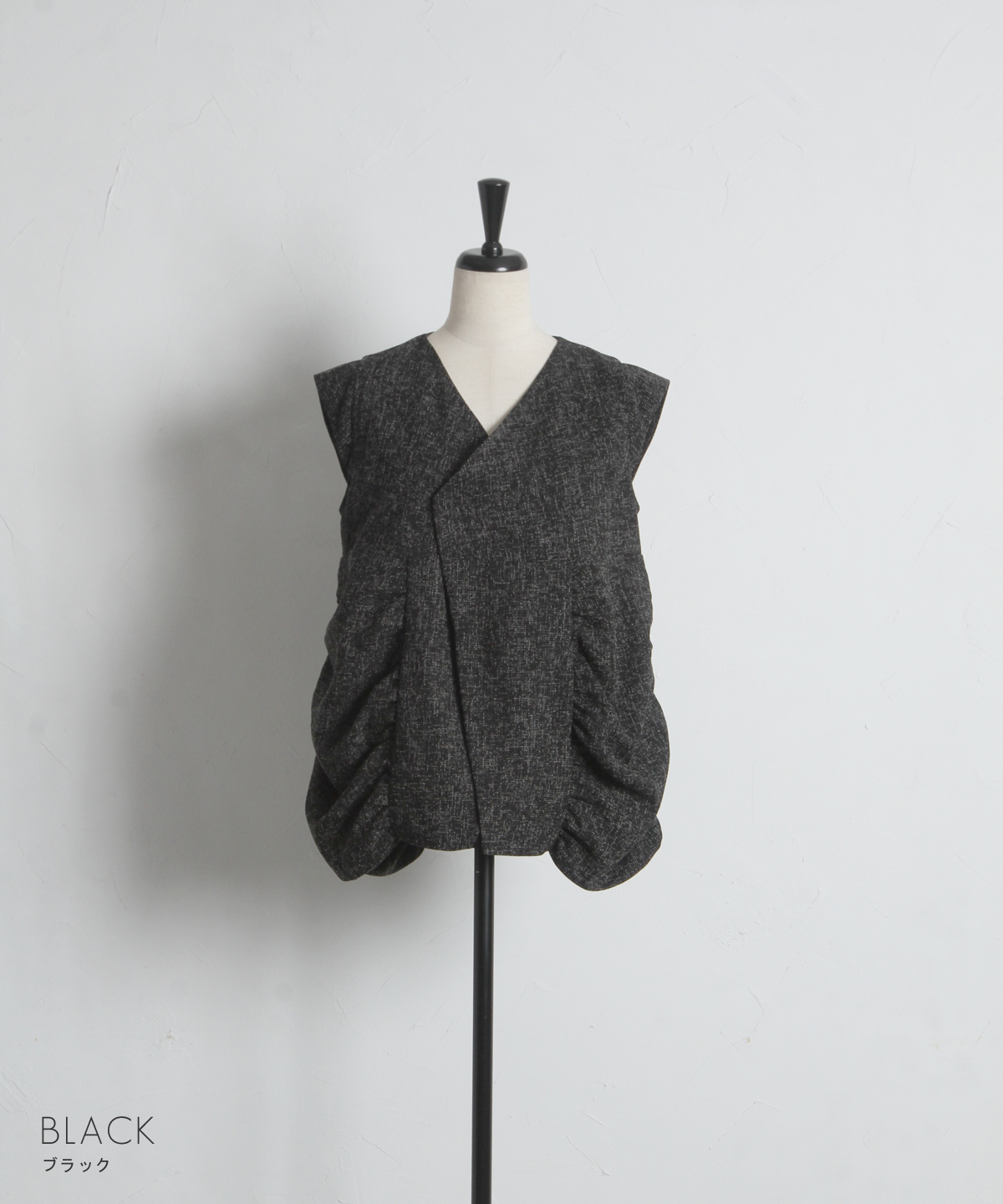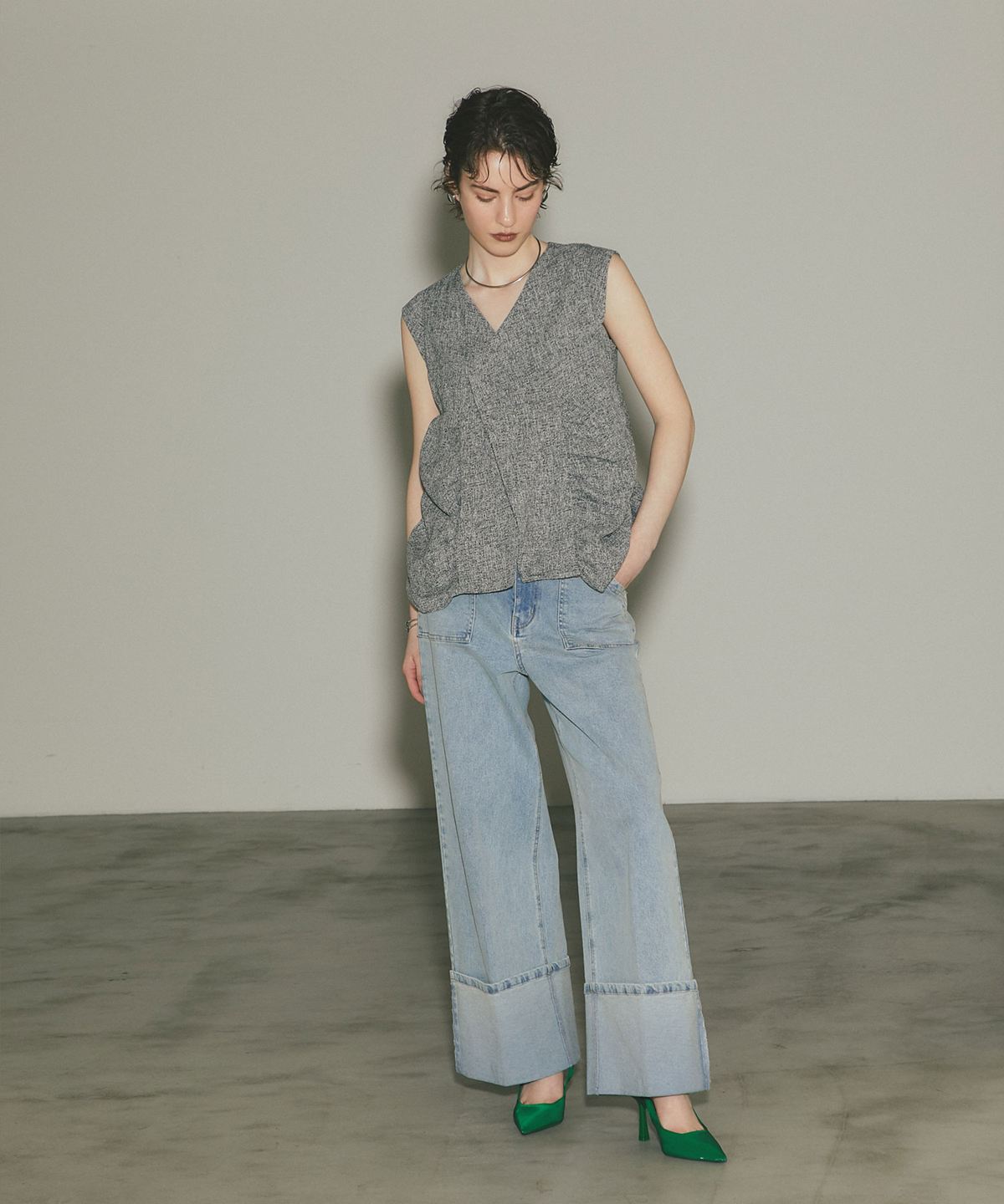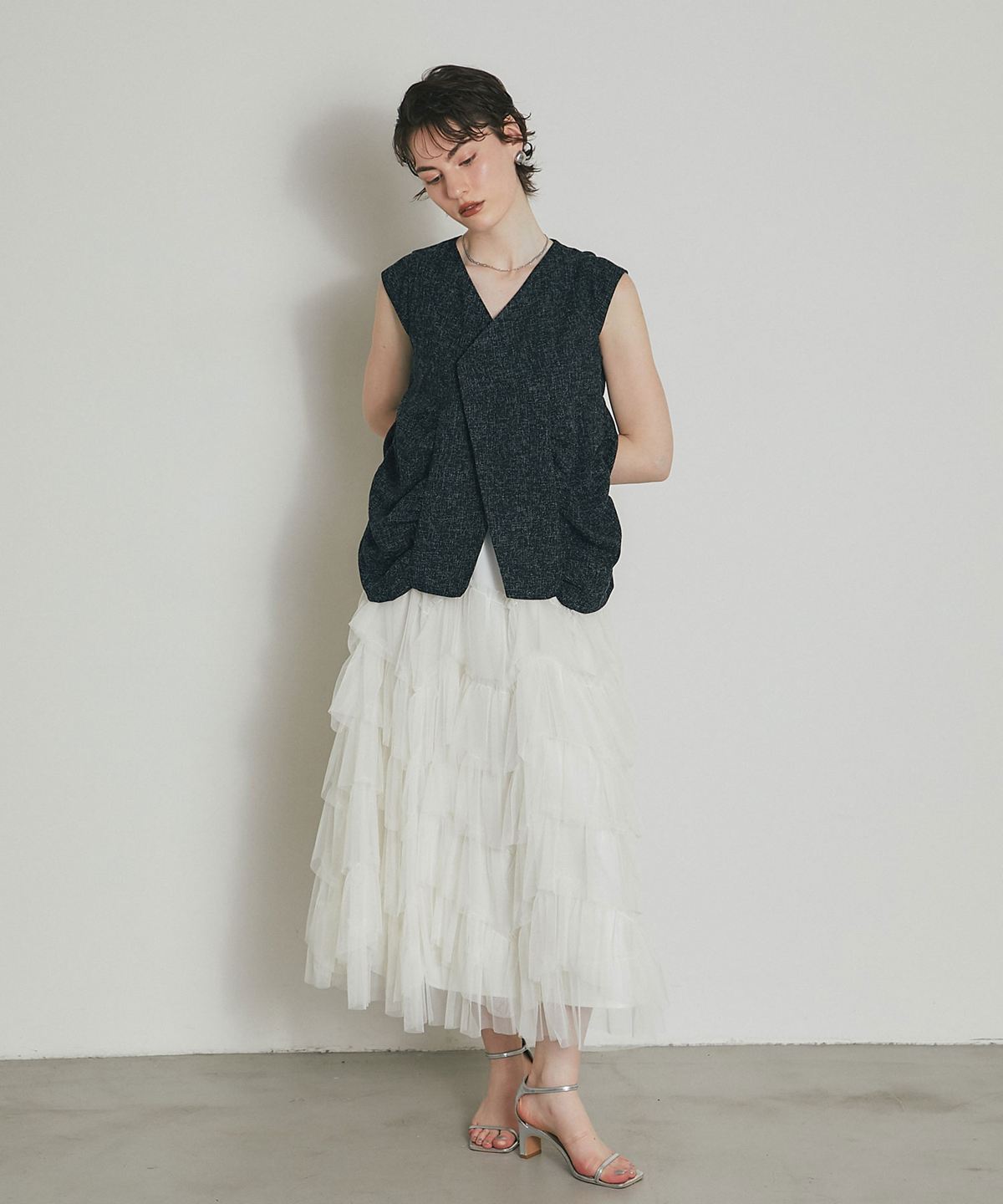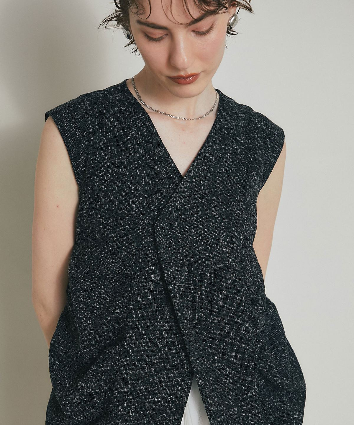 深めのVネックと裾のボリューム感が、洗練された都会的な印象を演出します。