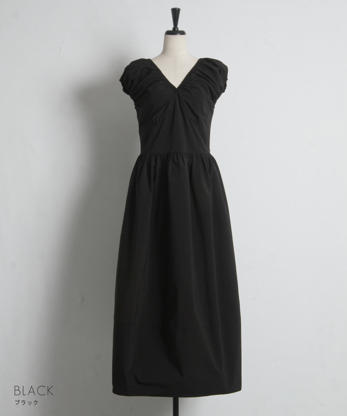 デコルテを美しく見せるVネックと、ウエストから広がるフレアラインが、凛とした佇まいを演出します。