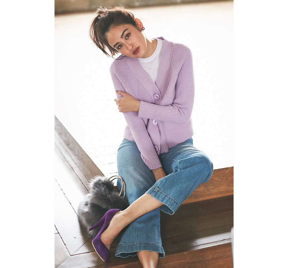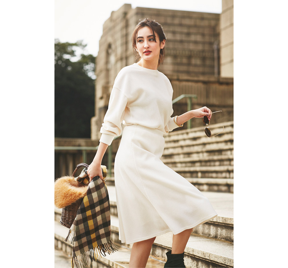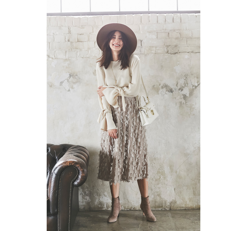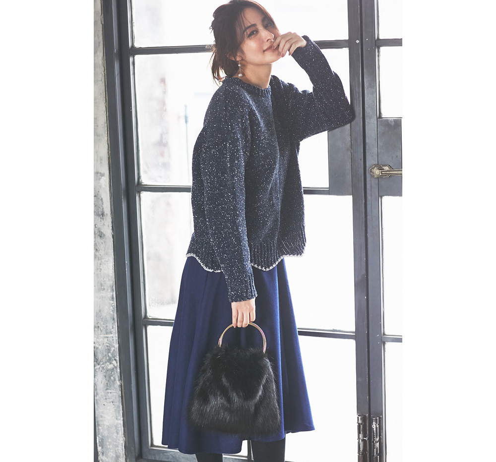tops:裾スカラップ刺繍ラメ入りニット¥4,900+tax bottoms:ウール混タックフレアスカート¥5,900+tax