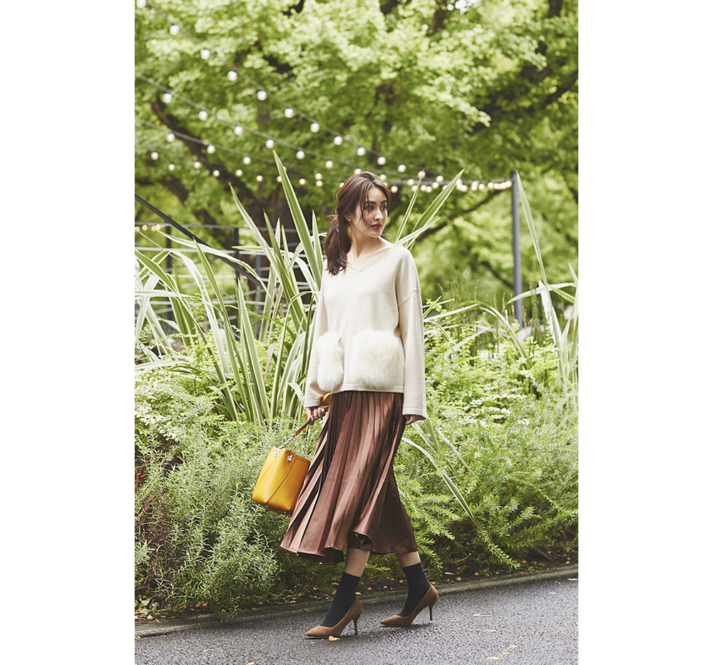 tops:ポケットファーニットプルオーバー¥3,900+tax bottoms:プリーツシャイニースカート¥3,900+tax