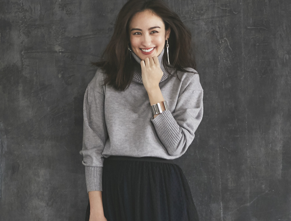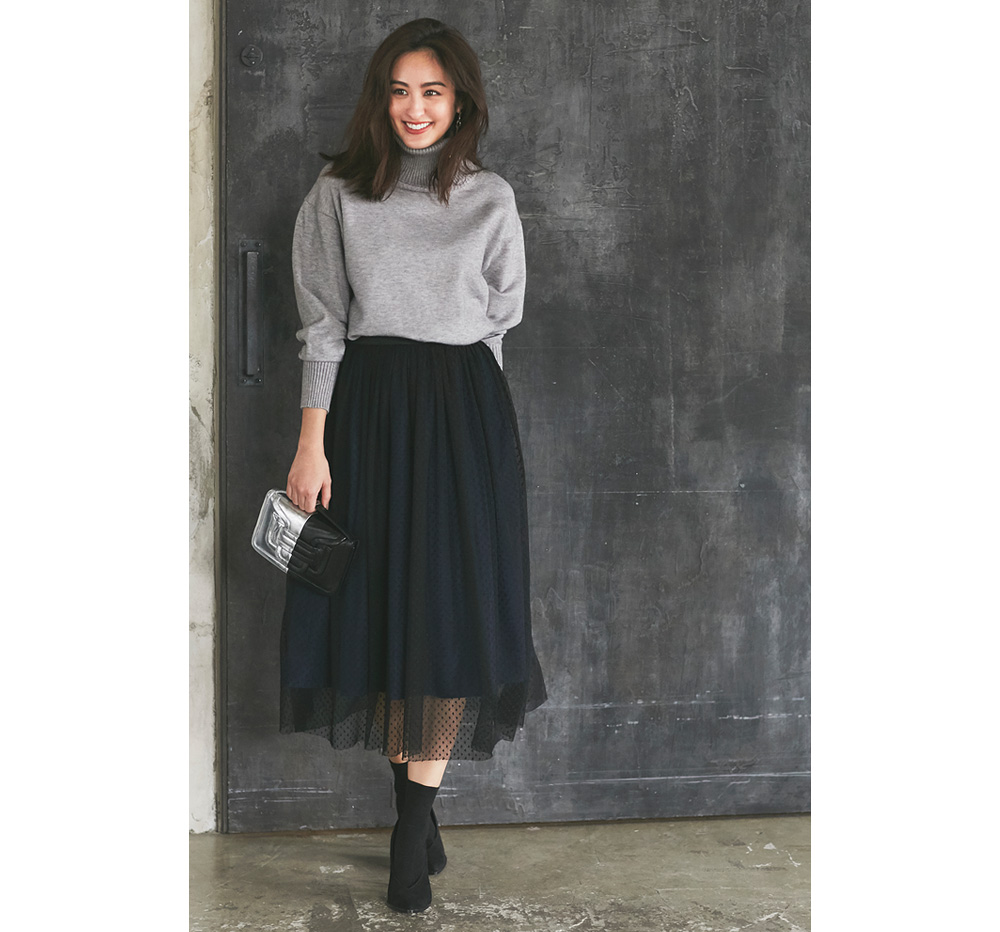 tops:タートルネックオーバーサイズニットプルオーバー¥3,900+tax bottoms:ドットレースセットスカート¥4,900+tax