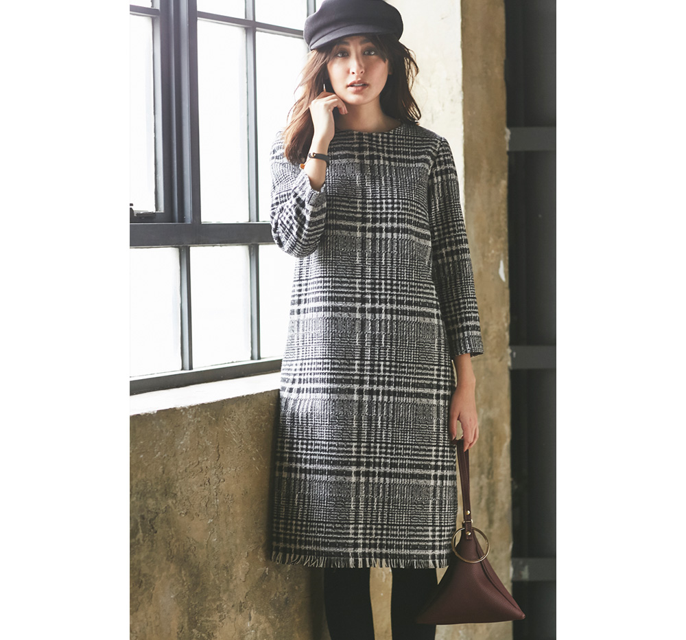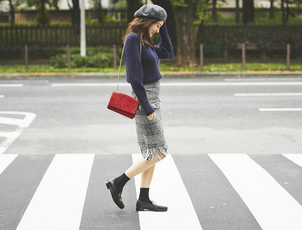 tops:バルーンスリーブニットプルオーバー¥4,900+tax bottoms:チェックツイードフリンジタイトスカート¥6,900+tax