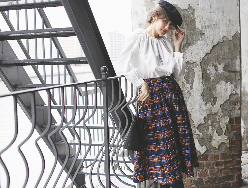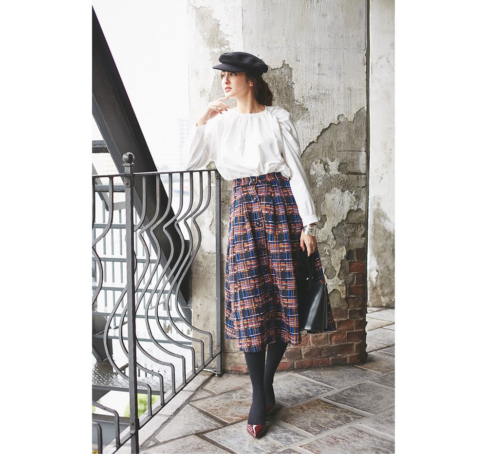 tops:ショルダーギャザーブラウス¥2,900+tax bottoms:カラーミックスツイードフロントボタンスカート¥6,900+tax