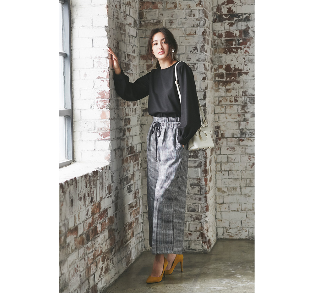 tops:ボリュームスリーブブラウス¥4,900+tax bottoms:チェック柄ワイドパンツ¥3,900+tax